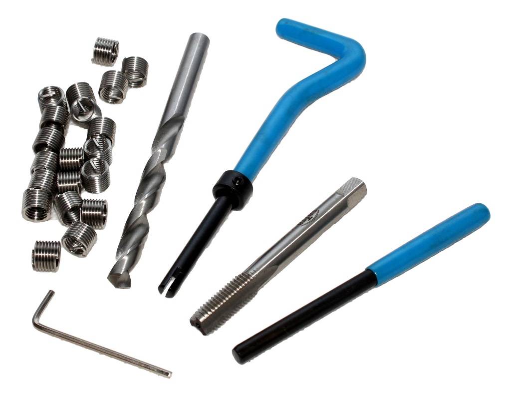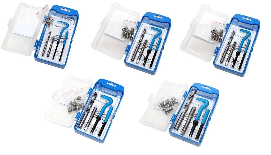 комплект для ремонту пошкодженої різьби в двигунах та інших компонентах транспортних засобів . Свердла і Мітчики виготовлені з швидкорізальної сталі HSS. Одноступінчасті Мітчики нарізають різьбу, в яку вставляється спіральна вставка з твердої нержавіючої сталі. Для вставки вставки використовується Направляюча ручка, а також перфоратор, яким я ламаю Виступаючий наконечник вставки.е> характеристики в комплекті: <вулик>