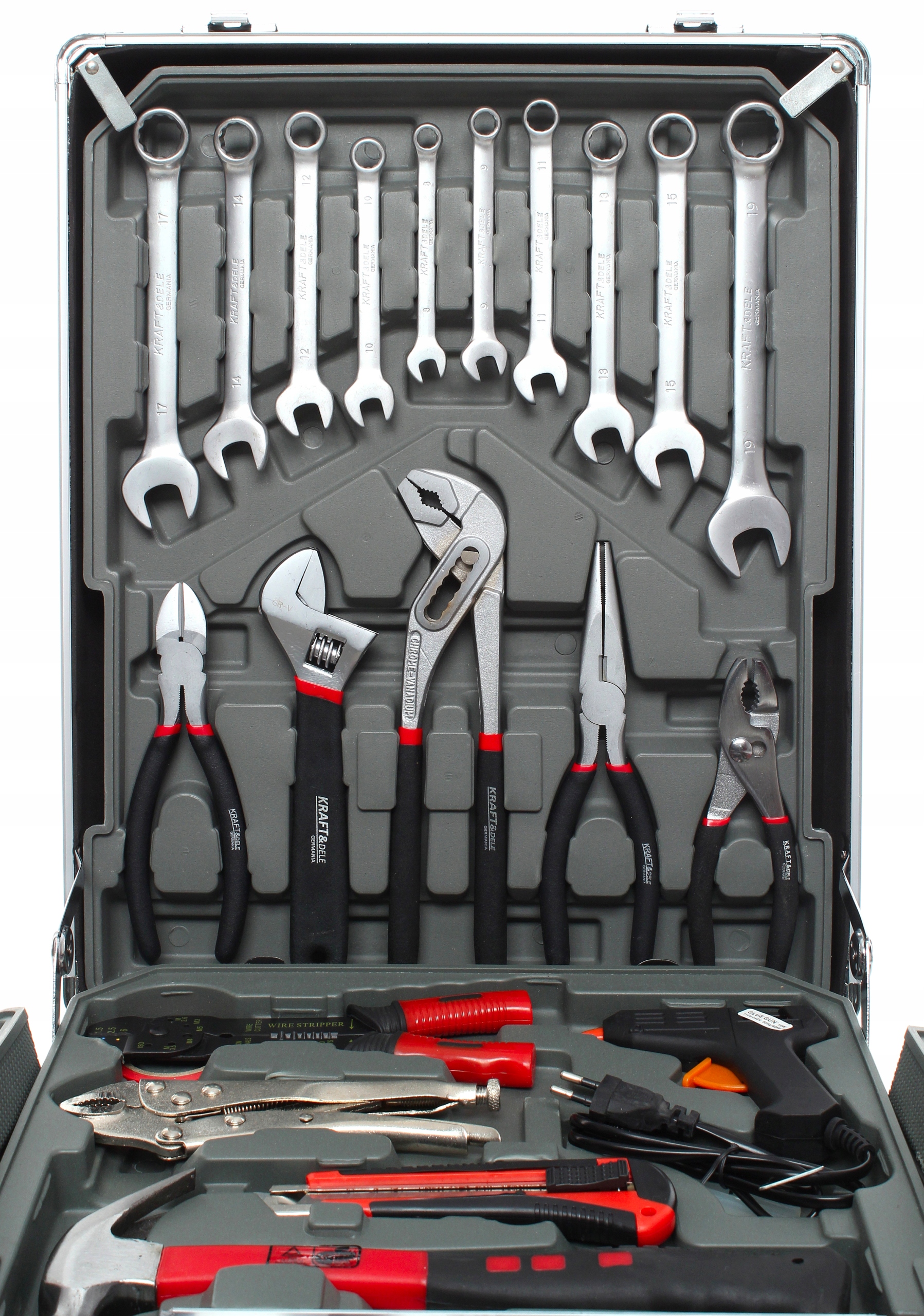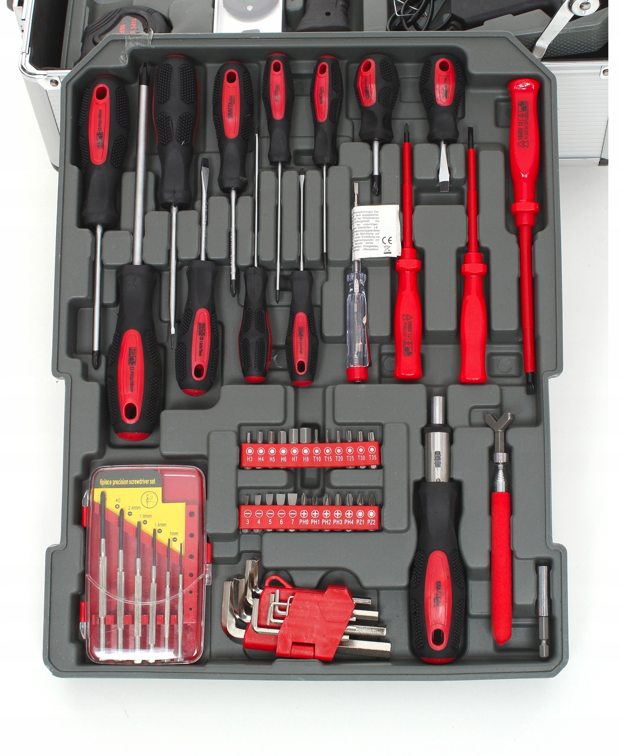 У набір входять: ключі ріжкові, торцеві ключі, тріскачка, молоток, набір плоскогубців, рівні, затискачі, мірна стрічка, ізоляційна стрічка, ніж, набір цвяхи та шурупи, а також викрутки та наконечники для бит .