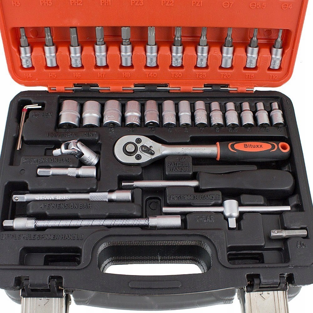 міцний набір інструментів 45 елементів. У комплект входять Біти, насадки, храповий ключ і додаткові аксесуари. Ідеально підходить як для дрібного ремонту, так і для професійних майстерень.