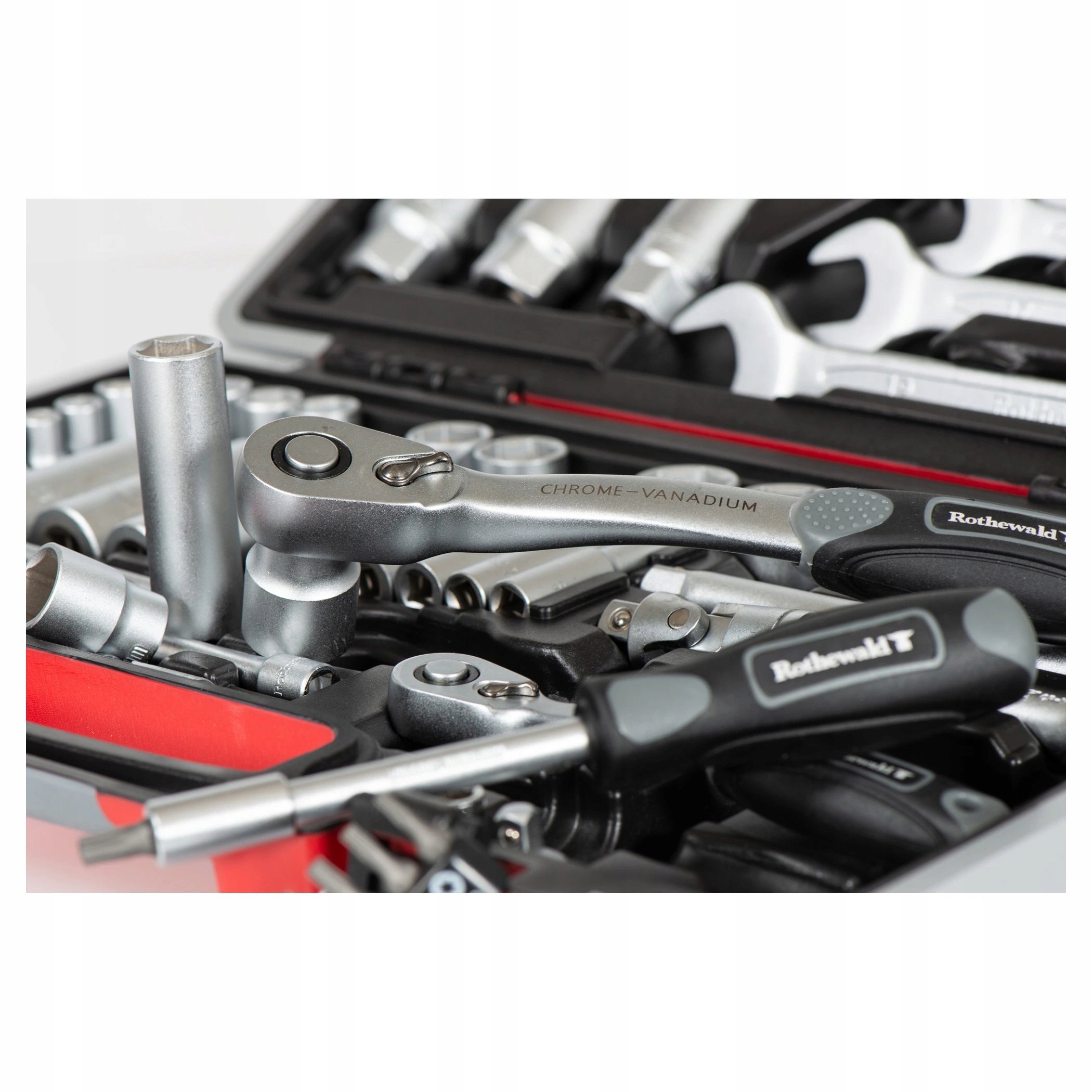 Цей набір інструментів включає дві тріскачки Rothewald з тонкими зубцями, які завдяки своїй ергономічній формі та зручному в утриманні, стійкому гумовому покриттю ідеально лягають у руку. Комбіновані накидні та накидні ключі з високоякісної хром-ванадієвої сталі з їх ніжною атласною поверхнею дійсно радують око. Універсальні з'єднання з пружинними шайбами всередині з'єднань завжди працюють плавно та полегшують контрольоване загвинчування та відкручування. Комбінація компонентів у компактному, ударостійкому пластиковому корпусі продумана та комплексна. Дюймові насадки для гвинтів Torx (T), гвинтів Phillips і гвинтів Allen згруповані та захищені від випадання в окремих знімних тримачах. І, звісно, усі шестигранні головки мають захисну конструкцію бокового приводу, яка дозволяє безпечно видаляти навіть пошкоджені гвинти.