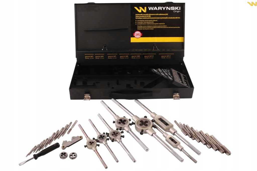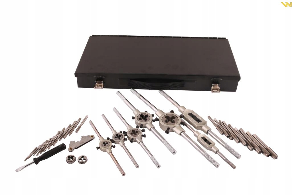 Комплект вміст : мітчики M3-M12, матриці M3-M12, тримачі, свердла, калібр, викрутка