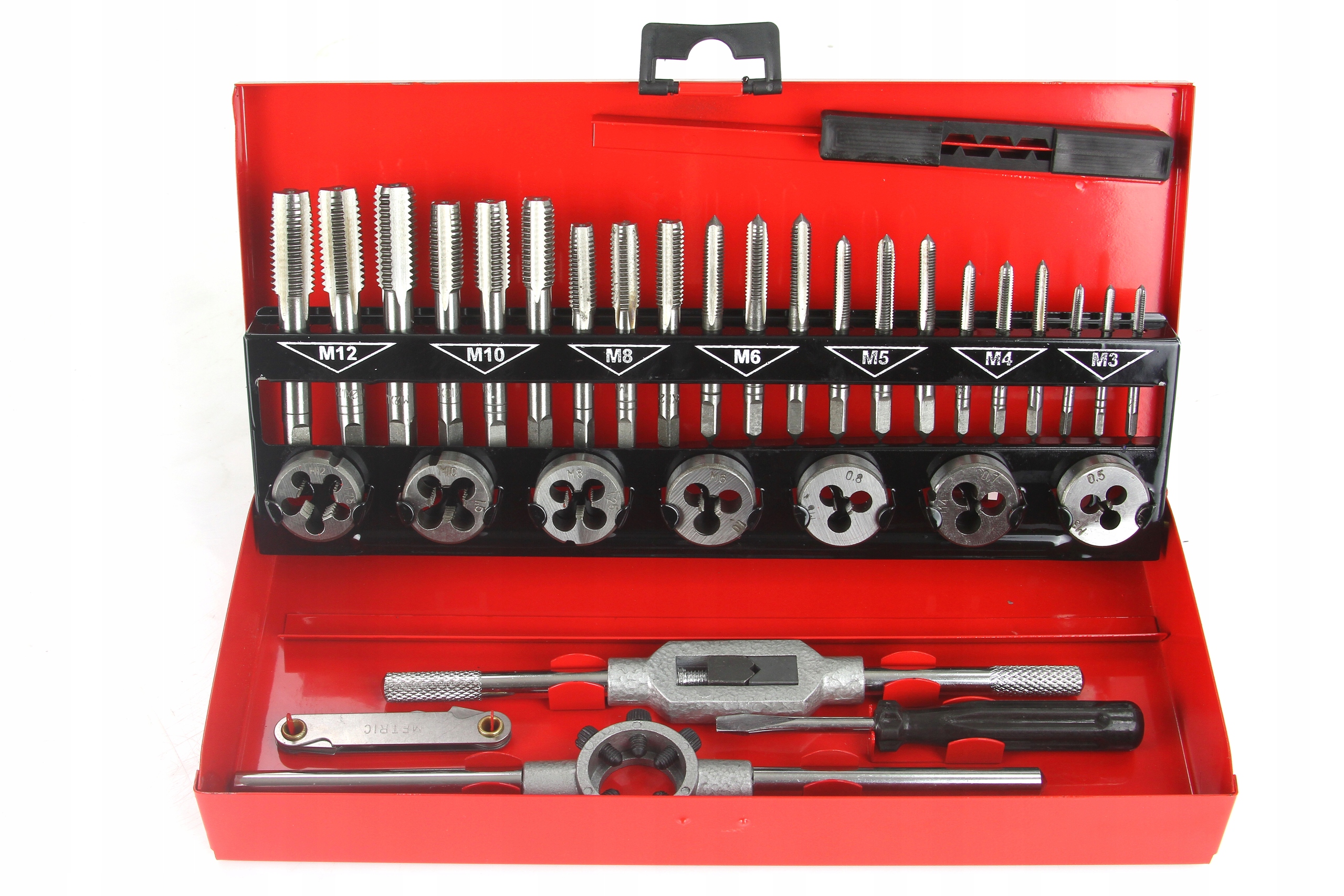 сучасний набір мітчиків і плашок м3-М12. У комплект входять 32 різних інструменту з високоякісної сталі. Все це було поміщено в металеву валізу для транспортування і зберігання.