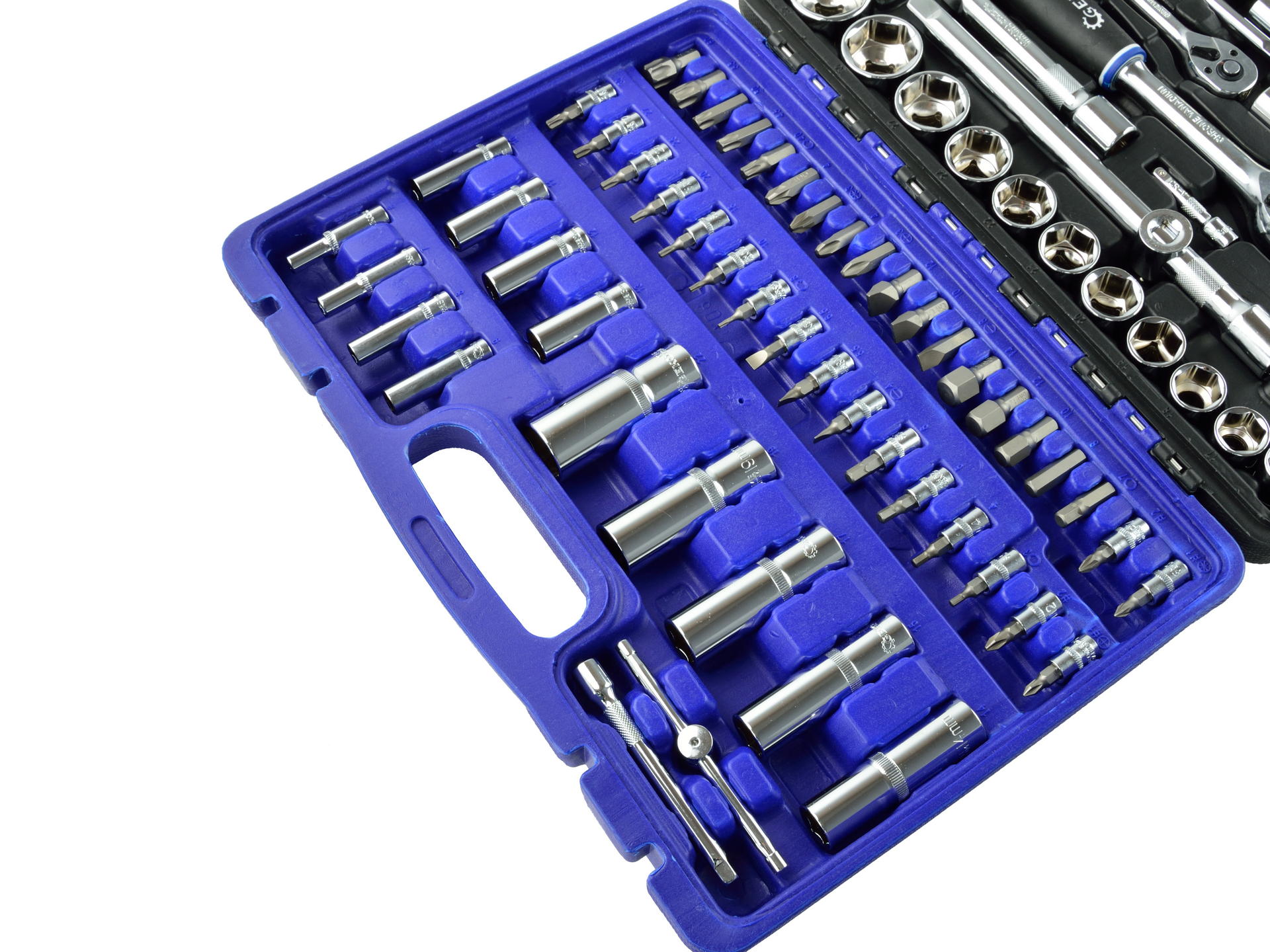 Набір торцевих ключів 1/2" і 1/4", 108 шт. Універсальний набір, призначений для майстерень, послуг і домашнього використання. Ключі виготовлені з високоякісної хромованадієвої сталі, упаковані в естетичний пластиковий футляр з металевими засувками.