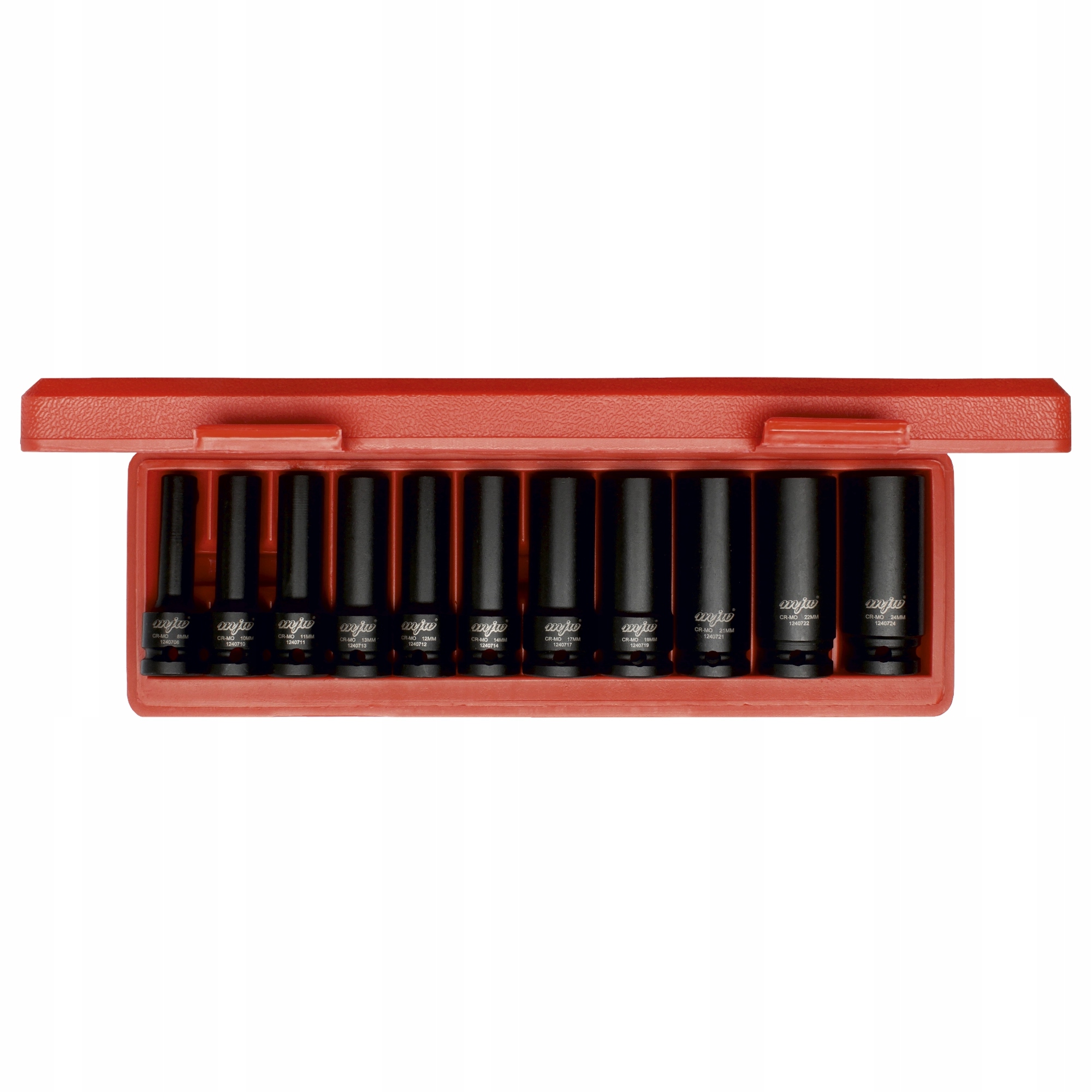 Кількість елементів: 11 Зміст: 8 | 10 | 11 | 12 | 13 | 14 | 17 | 19 | 21 | 22 | 24 Сталь CrMo найвищої якості, шестигранні наконечники із закругленими кутами захищають гвинти від пошкоджень Привід для пневматичних ключів і ручок діаметром 1/2" Діра в безпеці