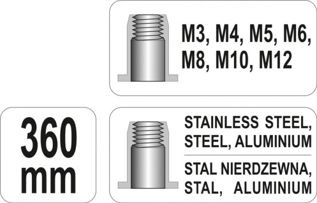 Ручний заклепувальник для заклепувальних гайок M3-M12 від YATO YT-36128. Заклепувальний пристрій, призначений для з’єднання матеріалів за допомогою заклепувальних гайок. Виконує з’єднання матеріалів за допомогою втулки з внутрішньою різьбою. Це дозволяє кріпити додаткові елементи металевими шурупами або шурупами. Головки розмірів: M3, M4, M5, M6, M8, M10, M12 виготовлені з міцної хромомолібденової інструментальної сталі CrMo. Ручки покриті нековзкою прогумованою накладкою.