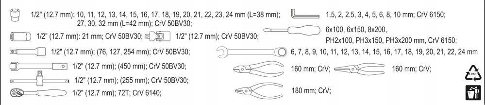 ковпачки виготовлені зі сталі CrV 50bv30, а біти - з високоміцної сталі S2. Інші аксесуари виготовлені зі сталі CrV 6140 і CRV 6150