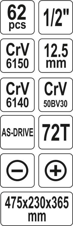 ковпачки оснащені системою as-Drive, що збільшує максимальний крутний момент на 25%, при повному захисті крайок гайок. Храповик має трикомпонентну рукоятку і 72 зубця (робочий хід 5 градусів) і систему QUICK RELASE " p>