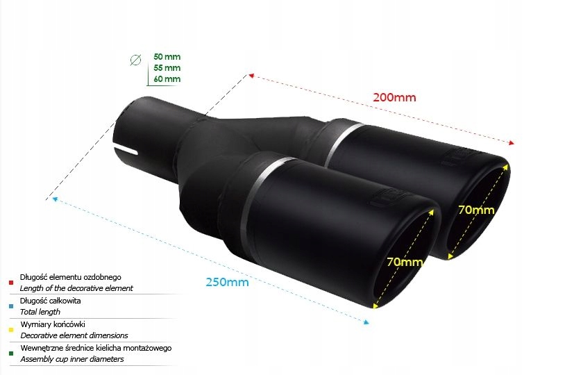 - загальна довжина: 250 мм