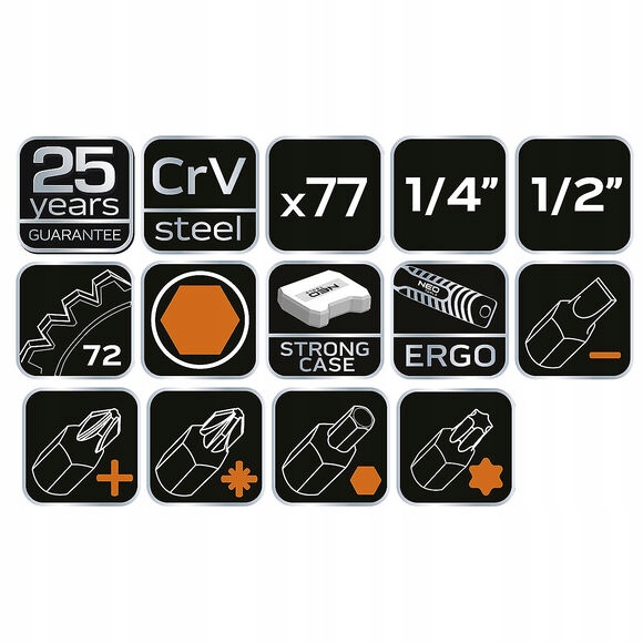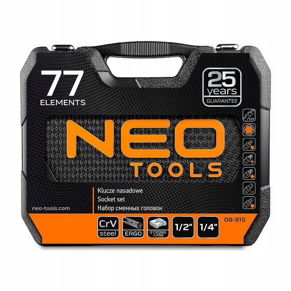 Колекція інструментів NEO TOOLS є ідеальною підтримкою для всіх ентузіастів механіки. Цей набір включає цілих 77 елементів, серед яких різні види інструментів, такі як тріскачки, головки, комбіновані ключі та багато інших необхідних пристосувань. Кожен елемент виготовлено зі сталі найвищої якості, що гарантує не тільки довговічність, але й безпеку під час використання.
