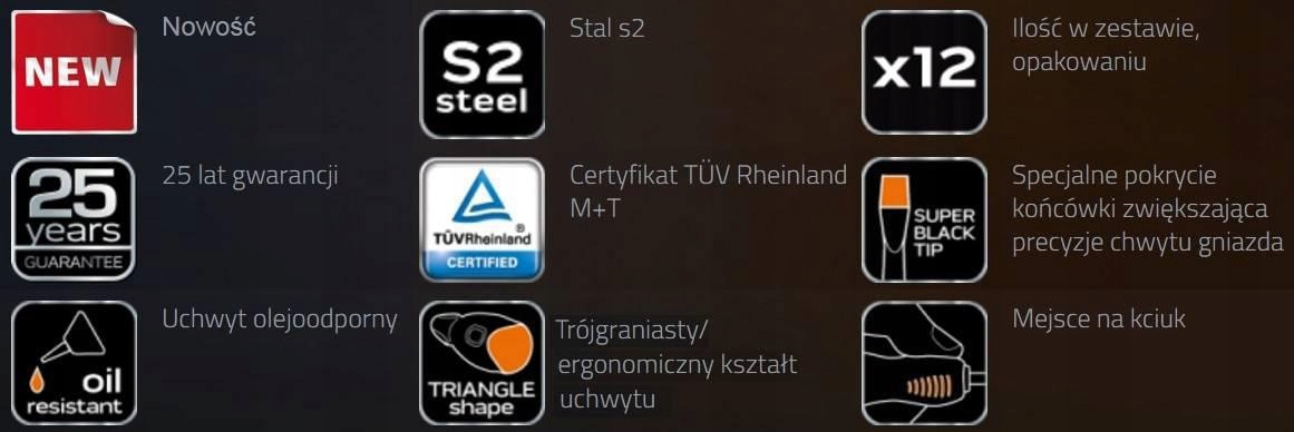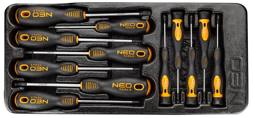 викрутки NEO (арт. 84-247) 12 викруток, наконечник викрутки виготовлений з надміцної сталі S2. Робочі наконечники грота були піддані термообробці, завдяки чому була досягнута відповідна твердість і стійкість до вигинів. Викрутки мають магнітні посилені наконечники. Тригранна форма рукоятки з контурною спинкою для великого пальця знижує навантаження на руку під час роботи і полегшує отримання оптимального крутного моменту. Двоматеріальна ручка запобігає ковзанню в руці, стійкий до впливу хімічних речовин, масел і мастил. Інструменти поставляються в практичній пластиковій штампуванні, що підходить для ящиків шаф інструментів NEO 84-221 і 84-222. Якість інструменту підтверджено сертифікатом TÜV і 25-річною гарантією виробника. Бренд NEO виправдовує очікування професіоналів.е>