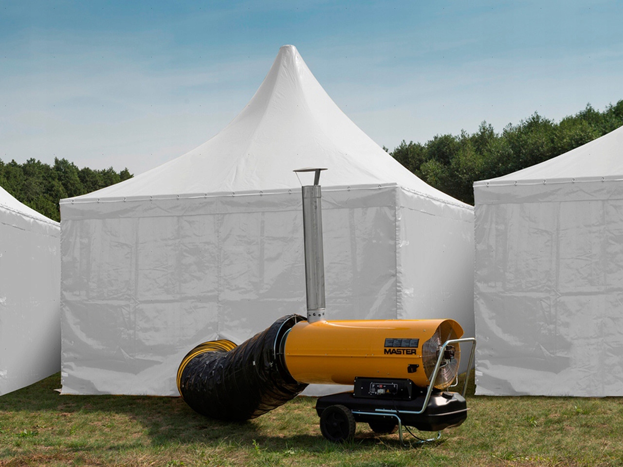 майстер-нагрівачі з відведенням вихлопних газів є дуже ефективними щодо опалення сільськогосподарських приміщень, майстерень, наметів, магазинів, складів, закладів громадського харчування, торгових і сервісних приміщень, громадських об'єктів, фабричних будівель, промислових об'єктів. Для цих останніх застосувань можна використовувати більше нагрівачів, щоб можна було достатньо нагріти приміщення.е>