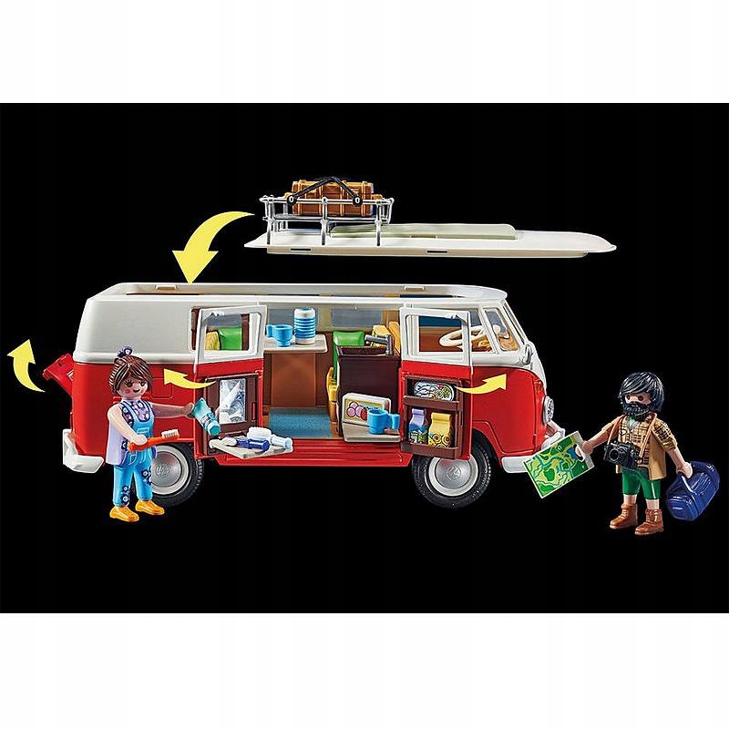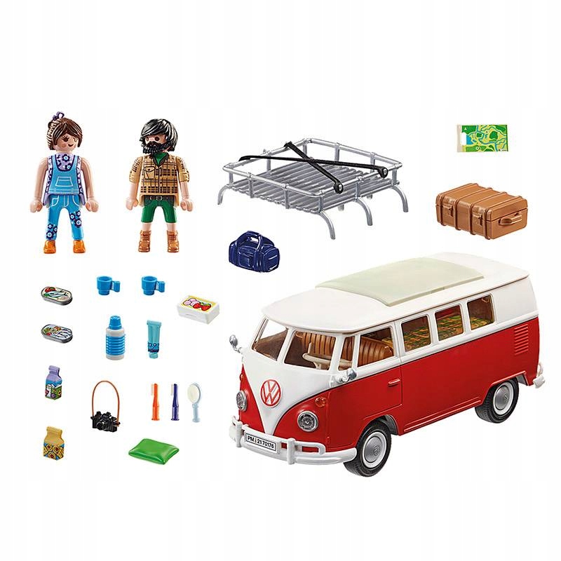 Кемпінговий автобус Volkswagen T1, улюблений поколіннями, десятиліттями був іконою на дорозі. Безліч шукачів пригод подорожували на ньому по всьому світу. Версія PLAYMOBIL класичного туристичного автобуса також має багато характерних деталей, таких як V-подібна передня частина з червоно-білою кольоровою гамою та червоним логотипом VW, округлий дах, розділене лобове скло та знімний багажник на даху. Після зняття даху відкривається автентичний дизайн інтер’єру. Всередині стильний T1 пропонує розкладний стіл з двома сидіннями, місцем для миття посуду та холодильником. Диван на дві фігури в типову клітку 1960-х розкладний. Бічні двері можна відкрити. Одні дверцята мають полицю для харчових продуктів, а інші мають відсік для речей, що відкривається, з вбудованим дзеркалом. Кемпінговий автобус Volkswagen T1: сідайте та вирушайте в дорогу! - насолоджуйтесь свободою!