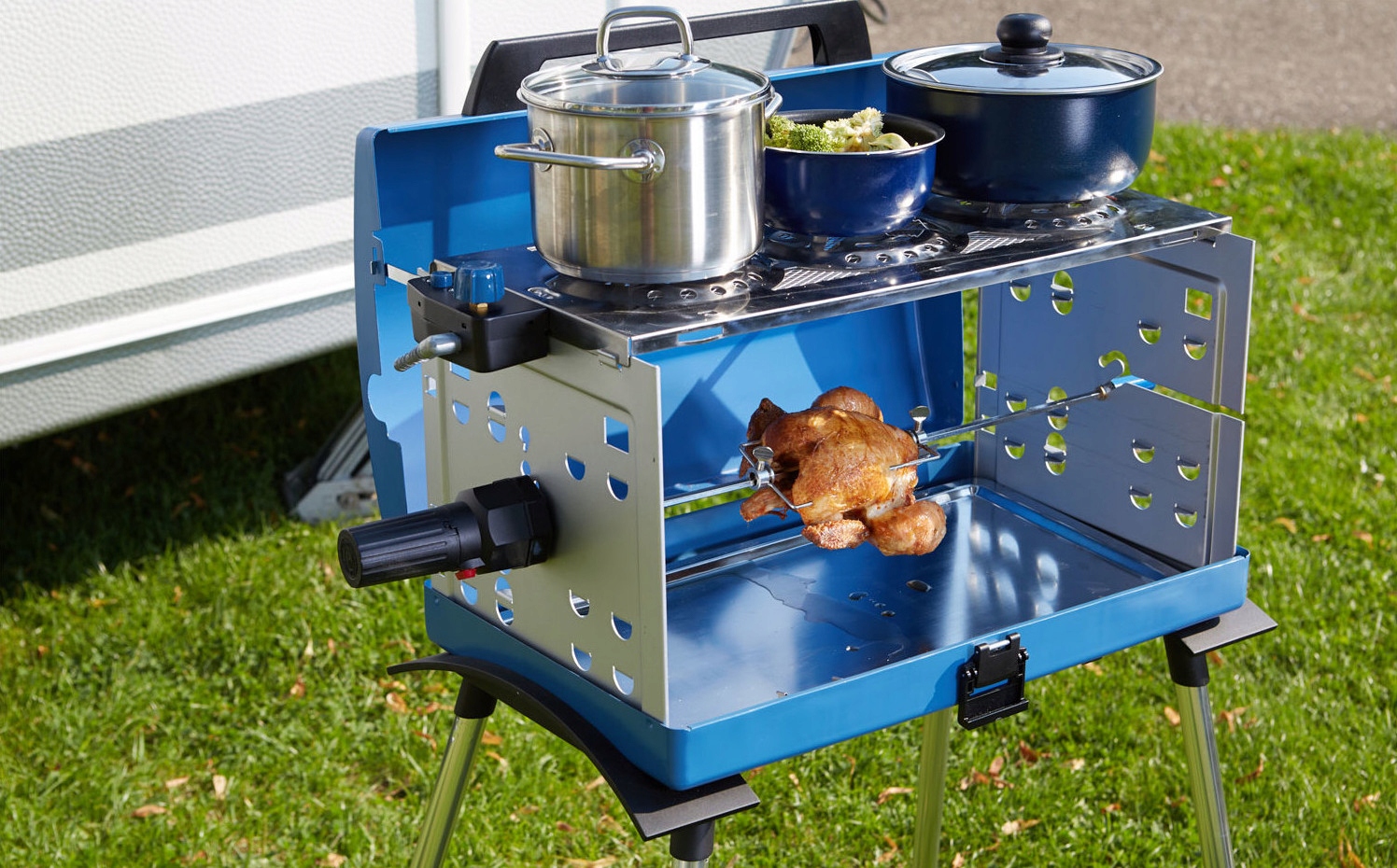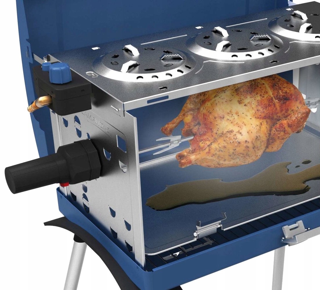 газовий гриль 400 SGR від Campingaz® - це універсальний пристрій, що дозволяє одночасно готувати кілька страв. Він має рожен, на якому можна запікати, наприклад, курку, а над ним можна готувати завдяки трьом конфоркам. Крім того, в складеному вигляді гриль перетворюється в зручний і невелику валізу для зручного транспортування і економії місця для зберігання.е>
