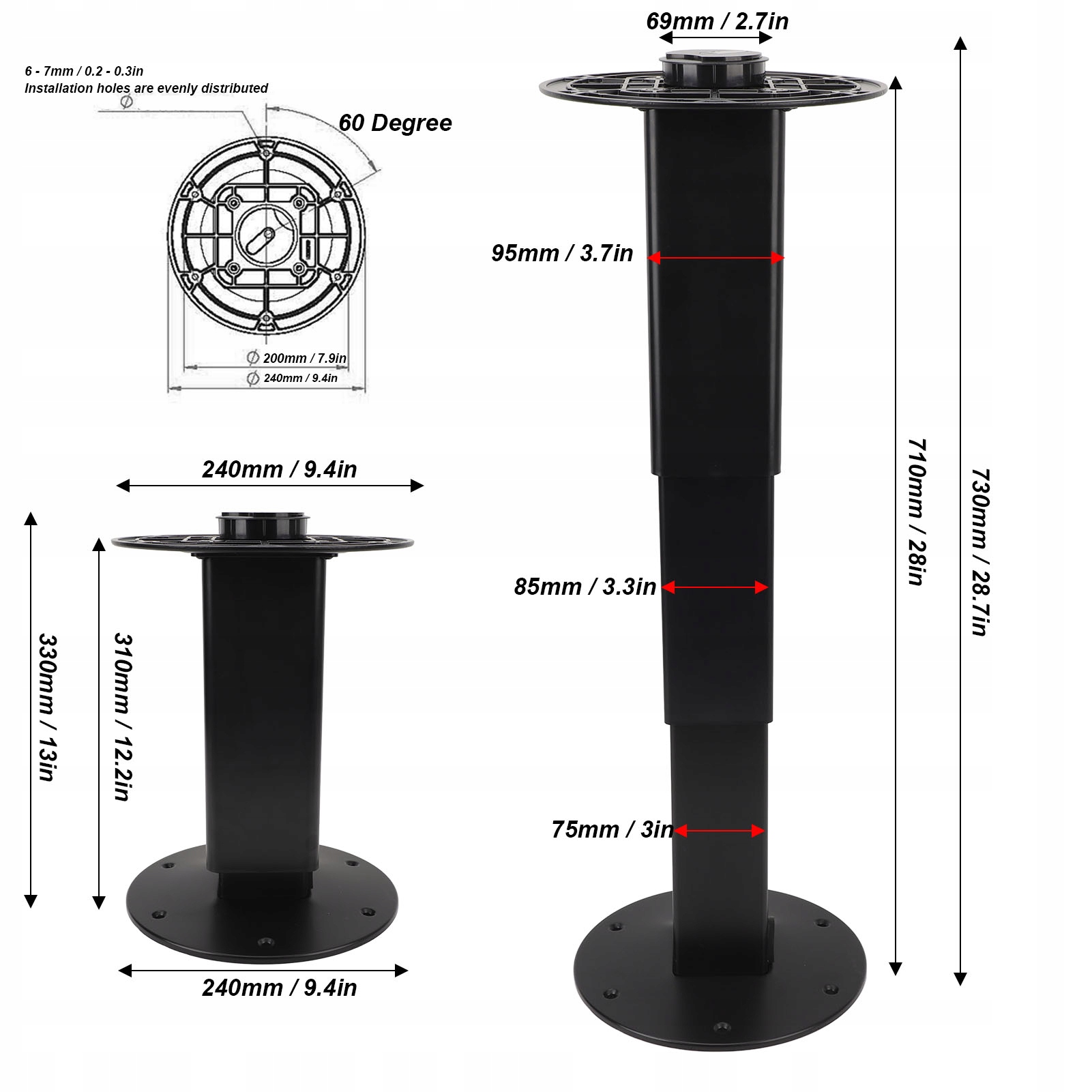 3. Безпечне кріплення: кругла основа діаметром 240 мм і кронштейн для кріплення столу забезпечують стійкість ніжок і стільниці столу. Отвори для гвинтів зарезервовані в опорній та верхній контактних пластинах для забезпечення надійного кріплення.