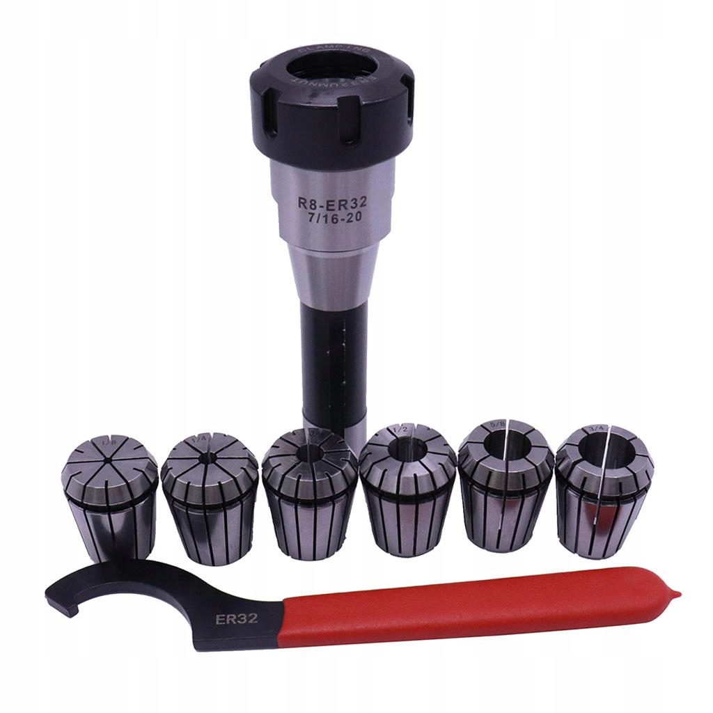 упаковка в комплекті: 1 шт R8 хвостовик Er32 цанговий патрон 6 шт. Набір пружинних Цанг ER32, 1 шт. гайковий ключ ER32