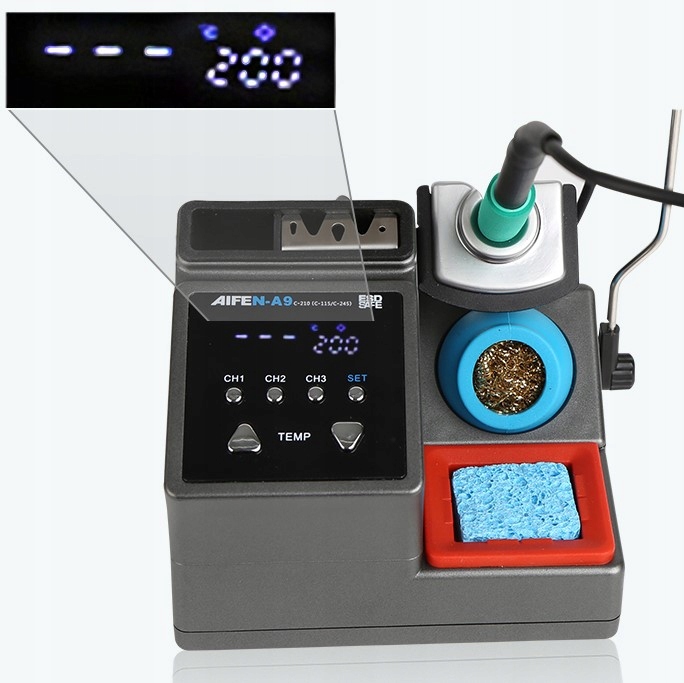Паяльна станція A9 оснащена чітким дисплеєм і 3 каналами з функцією запам'ятовування налаштувань.