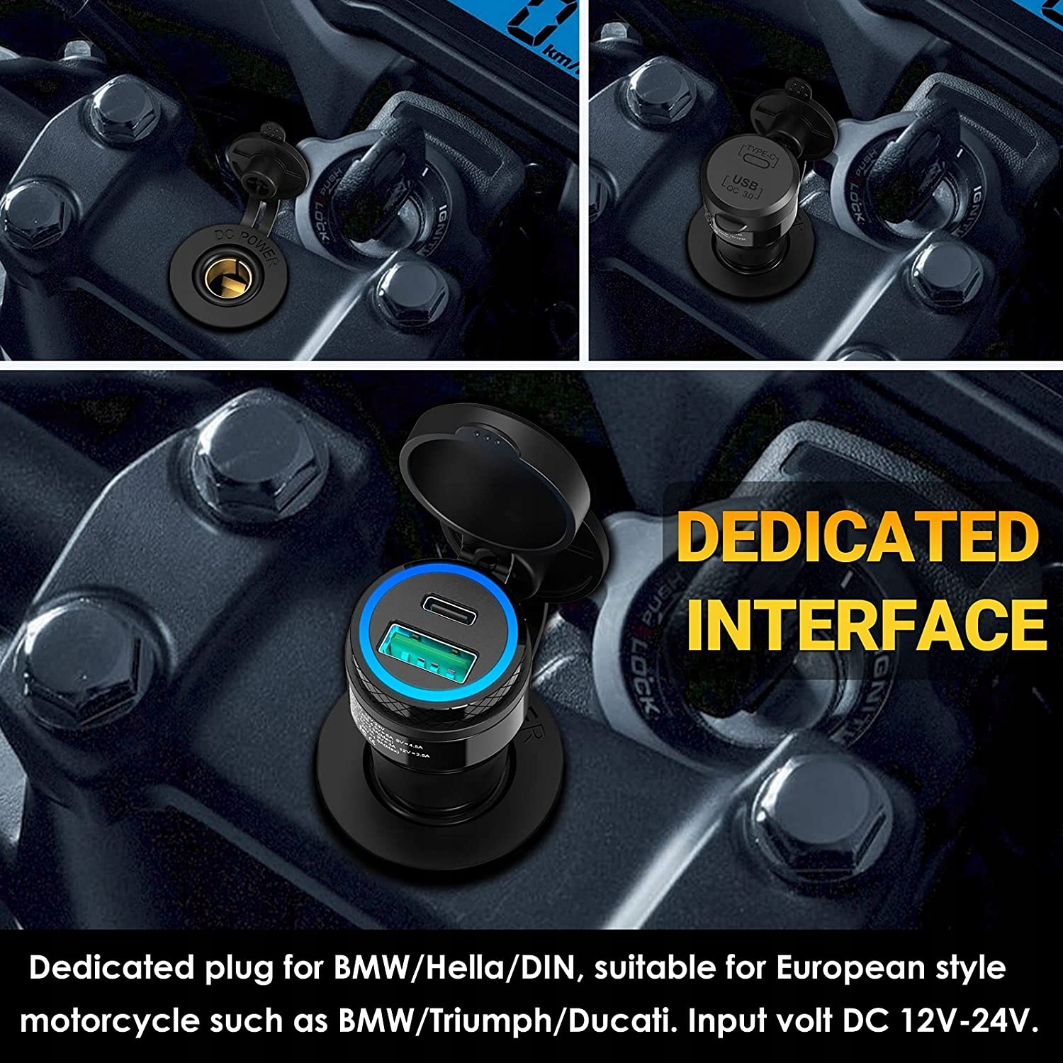 роз'єм HellaDIN Цей USB-адаптер для мотоциклів підходить для гнізд мотоциклів HELLADIN BMW або інших європейських мотоциклів, таких як Ducati Triumph . Швидке підключення PDQC 3.0 цей адаптер для мотоциклетної розетки USB C поставляється з usbc 30wpd3.0 дикий телефон або галактика з кращими можливостями. USB QC 3.0 розрахований на потужність до 18 Вт і забезпечує в чотири рази більш швидке налаштування ni для стандартного adowarks. Надміцний корпус з алюмінієвого сплаву з високою стійкістю до високих температур і корозії. Високоякісна гумова вісь 100 ефективно захищає від води і пилу. Сучасний Світлодіодний світло вбудована крута і модна Світлодіодна лампа Wild zalepce LED mona розпізнає електричний статус, а потім виявить положення USB-пристроїв вночі. Ефективна безпека вбудований чіп Smart IC. Захистіть пристрій від перегріву або короткого замикання. Апарат МНС грамотно розпізнає апарати і забезпечить їм найкращу якість обслуговування. Сертифікація UL CE та FCC. Тепле нагадування Номінальна напруга живлення USB становить 1224 в.Вхід 12 В від USBC макс. Вихід 20 Вт Вхід 24 в usbc максимальний вихід 30 Вт.