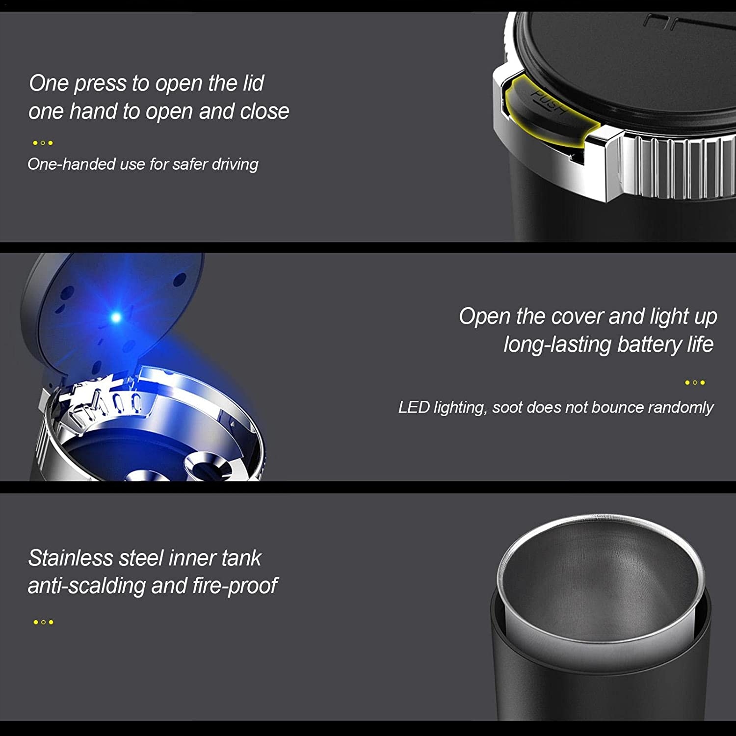 проста опуга один надріз для відкривання кришки один надріз для відкривання і закривання. Ця автомобільна попільничка з кришками МОА була обшита однією з найбезпечніших машин. Світлодіодна оплетка ця автомобільна попільничка зі світлодіодним підсвічуванням відразу ж при відкритті кришки, а світлодіодна оплетка длітсяо Дуго. Конструкція кришки запобігає крадіжці сажі. Відсутність специфічного запаху спеціально розроблений внутрішній герметик попільнички МНС зупинить поширення диму в автомобілі, збереже повітря і захистить здоров'я. Вогнетривка ця автомобільна попільничка з кришками mona atwo розбирається обертанням для очищення сажі. Металева підкладка не боїться тепла або вогнезахисних елементів і безпечна у використанні. Універсальні попільнички ця автомобільна попільничка moe від однаково практичного організатора або maym bin підходить для домашнього офісу автомобіля і внутрішнього і зовнішнього ресторану.е>