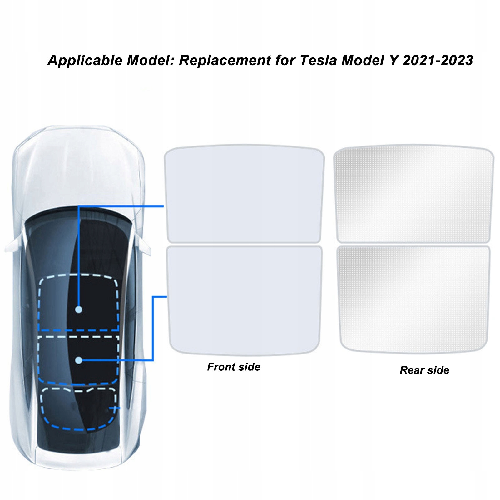 1. Модель застосування: сонцезахисний козирок для скляного даху автомобіля є заміною Tesla Model Y 2021 до 2023 року, будь ласка, перевірте модель і рік перед замовленням.