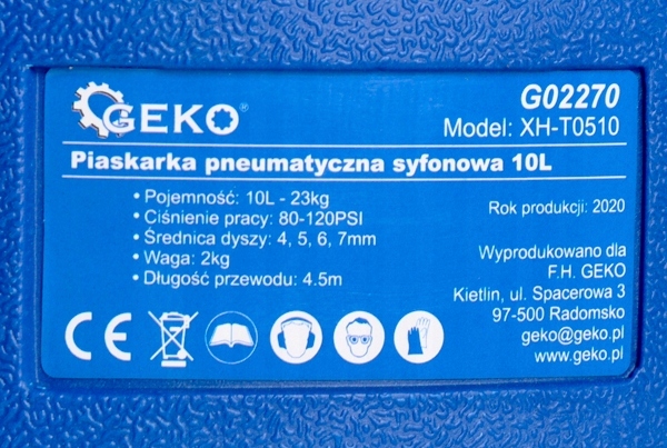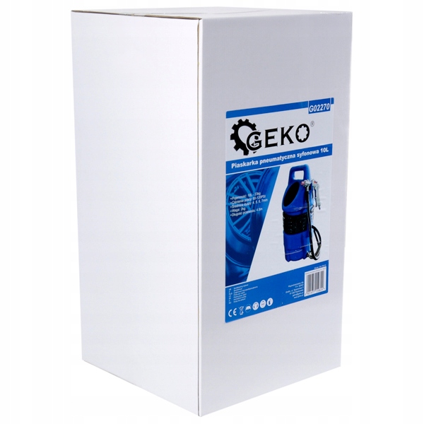 пневматичний сифонний піскоструминний апарат марки GEKO ємністю 10 л виготовлений з високоякісного пластику з підвищеною стійкістю до механічних пошкоджень.