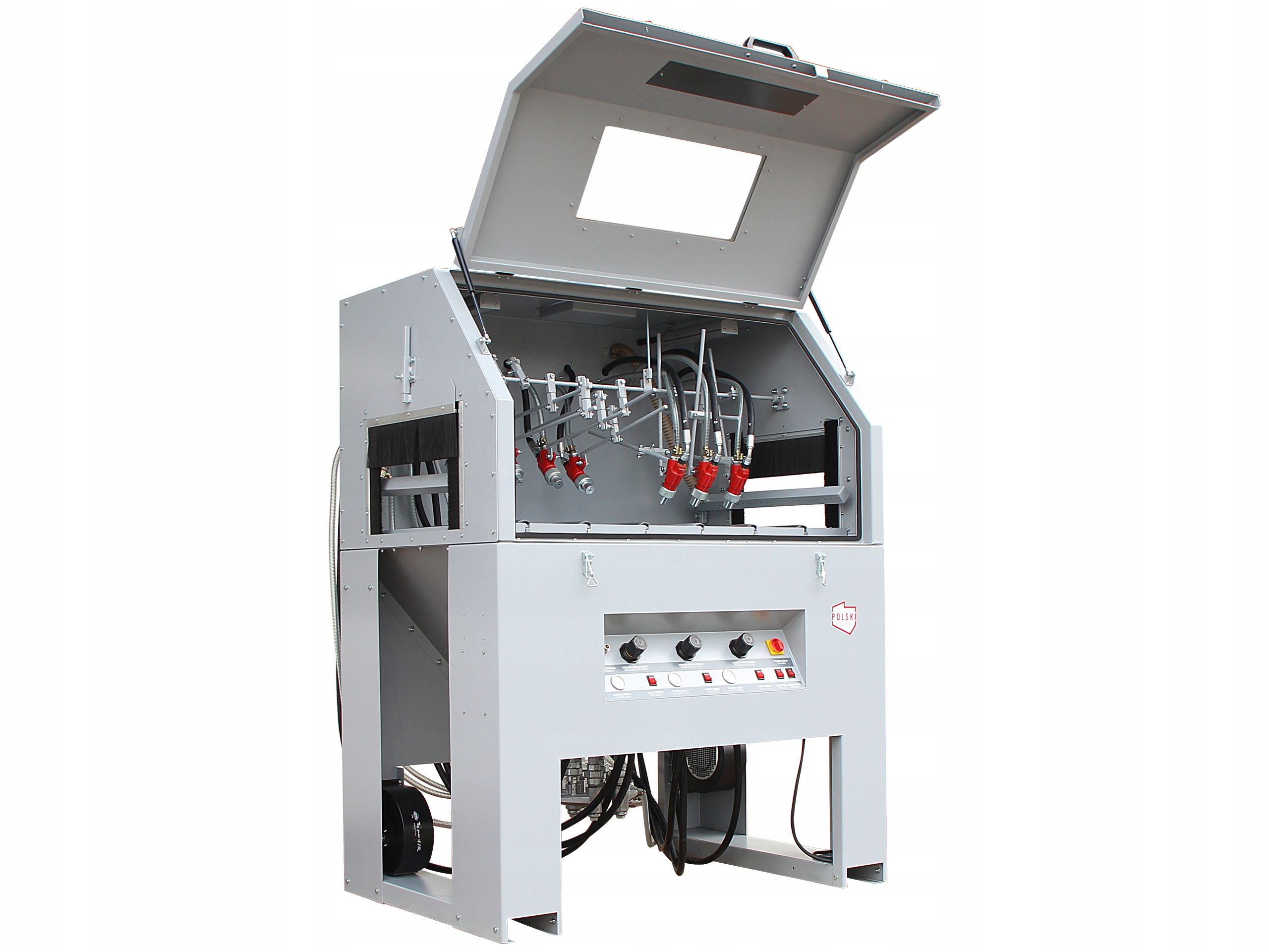 пропонований кабінний піскоструминний апарат - це професійне, безпечне і сучасне Напівавтоматичне пристрій польського виробника. застосування інноваційних конструктивних рішень дозволяє автоматичну обробку деталей вагою до 350 кг в камері з робочими розмірами 1 330 x 860 x 700 мм під тиском до 10 бар. Через промислового призначення запропонована очисна машина оснащена 8 наборами високоякісних вакуумних абразивних клапанів німецької марки BRAGO, що характеризуються механічною міцністю вище середнього і стійкістю до стирання по порівнянні зі стандартними клапанами, встановленими на очисниках конкуруючих компаній. Управління очищувачем просте і безпечне, завдяки використанню рухомий інтуїтивно зрозумілою панелі управління.