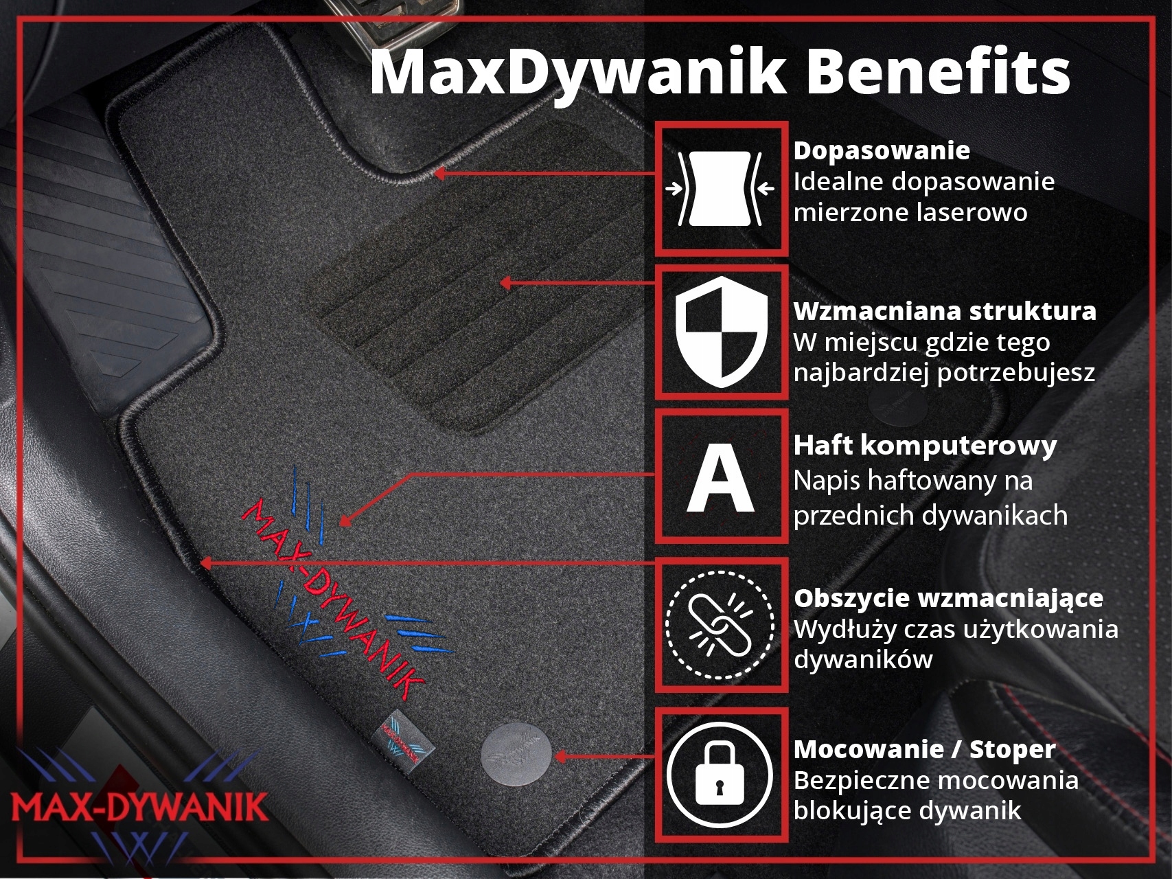 основною перевагою пропонованих килимків є посилене посилення на килимку водія. Завдяки застосуванню інноваційної технології ультразвукового зварювання футеровки отримано дуже естетичний продукт, основною перевагою якого є висока довговічність і функціональність. Килимки отримали новий унікальний дизайн і в той же час усунули недолік накладних підсилень (вистукування або стирання ниток)