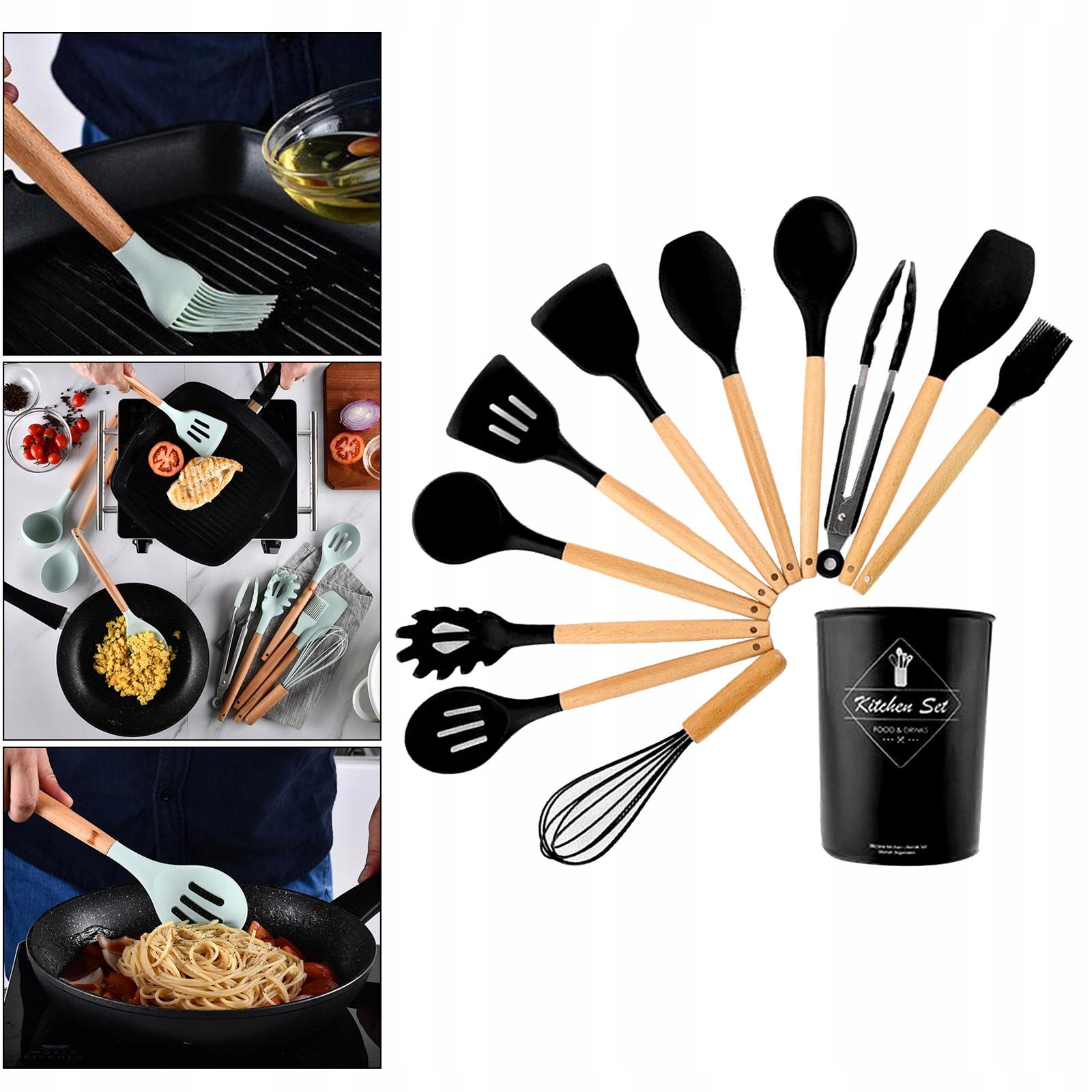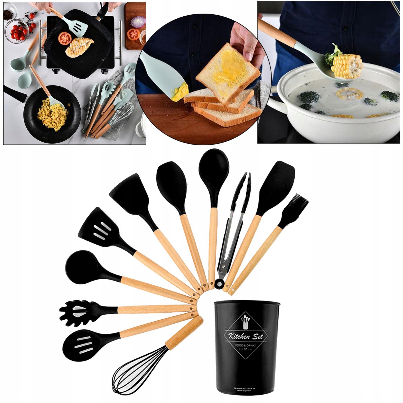 Посуд харчового класу, 11 шт., дерев'яна ручка, ложка, пристосування, чорний