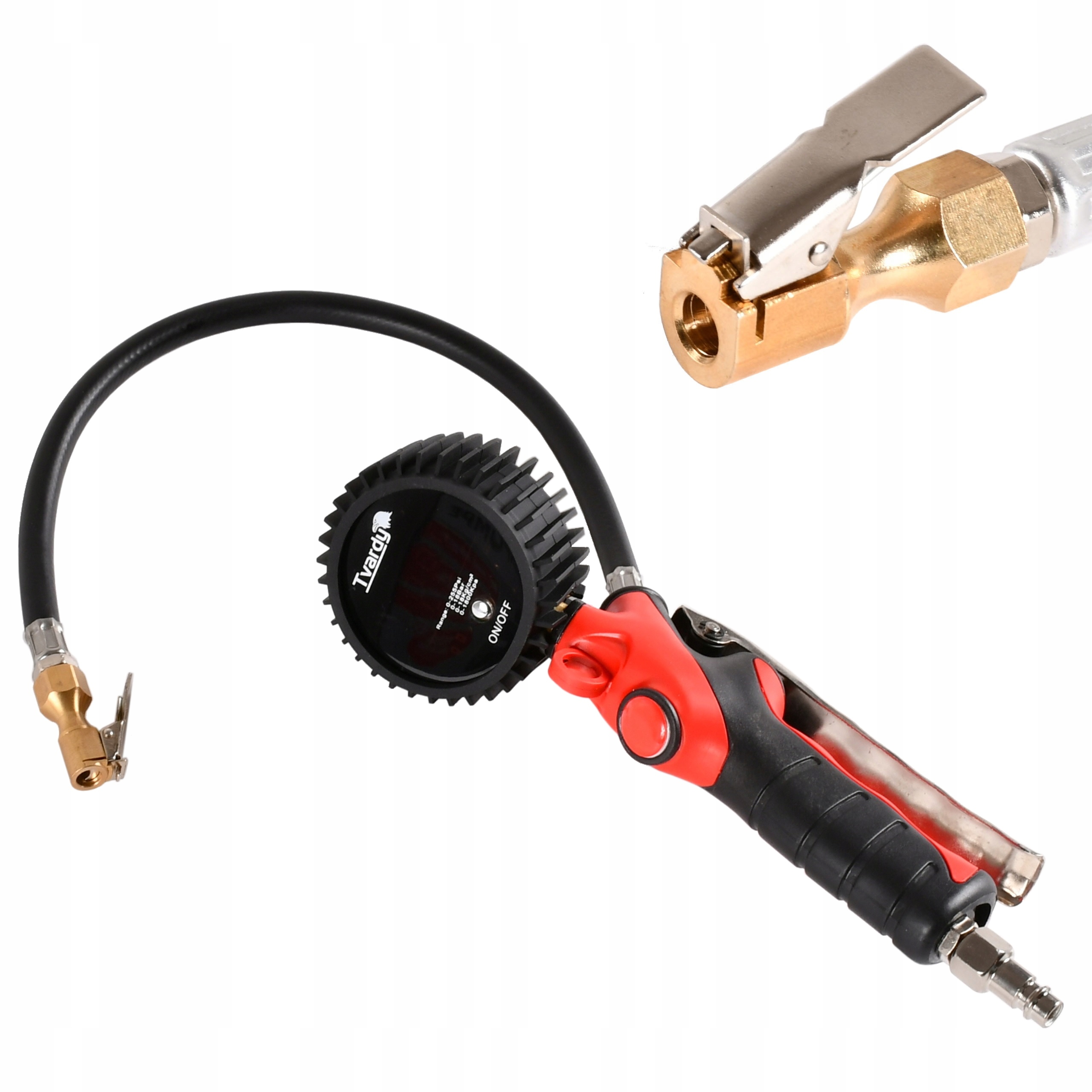 Оснащений гнучким шлангом довжиною 45 см і великим, легким для читання манометром з рідкокристалічним дисплеєм у гумовому чохлі, що захищає від ударів і ударів.