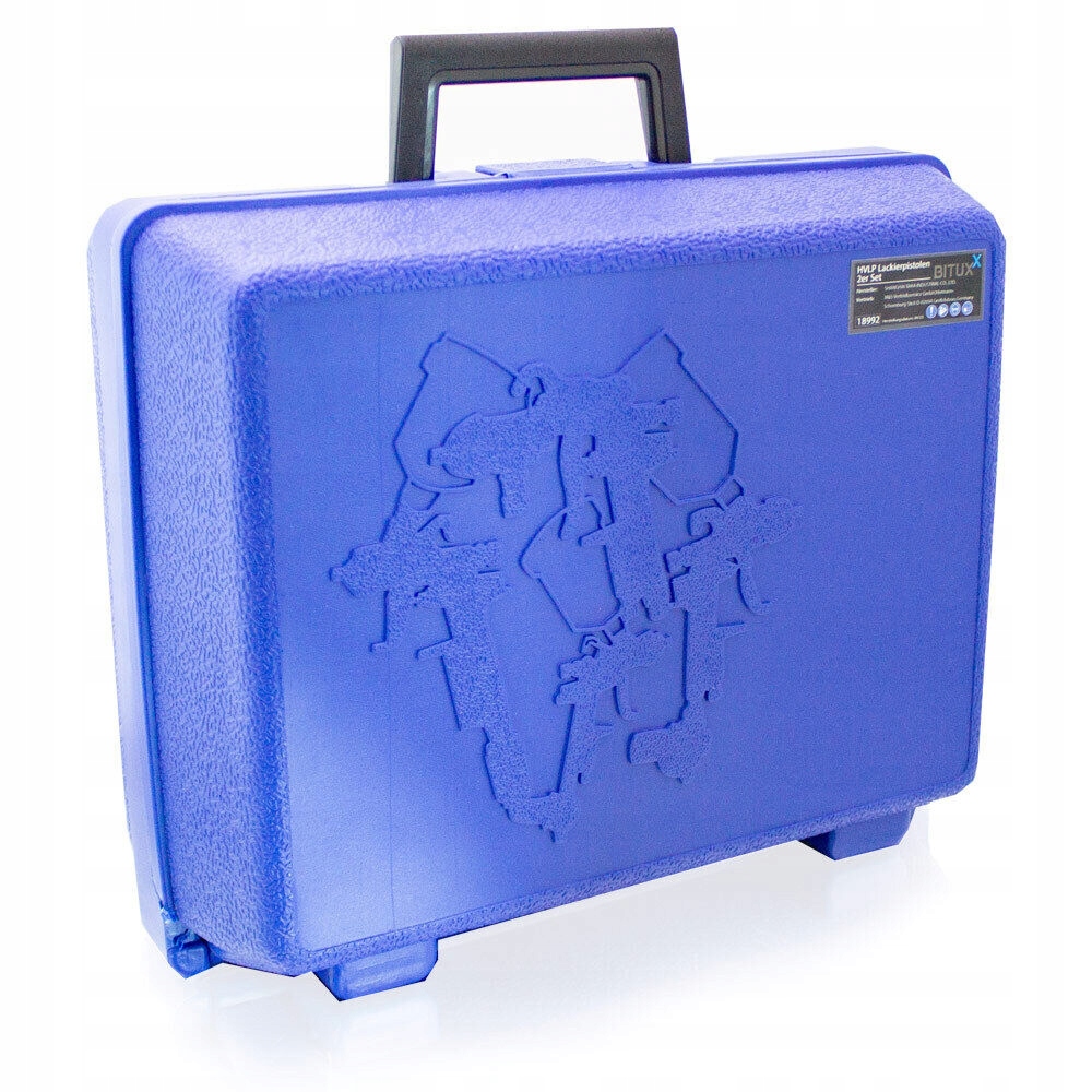 Набір пістолетів HVLP в транспортному футлярі. Пістолети характеризуються низьким споживанням повітря та хорошим покриттям матеріалу, при цьому економлячи його завдяки технології HVLP. Технологія HVLP дозволяє зменшити кількість туману та заощадити матеріал до 30%. Форсунки виготовлені з нержавіючої сталі, що забезпечує їх тривалий термін служби. Рушниці можна повністю розібрати для чищення. Пістолети, контейнери та аксесуари для чищення розташовані в зручній валізі, що дозволяє безпечно зберігати та транспортувати.