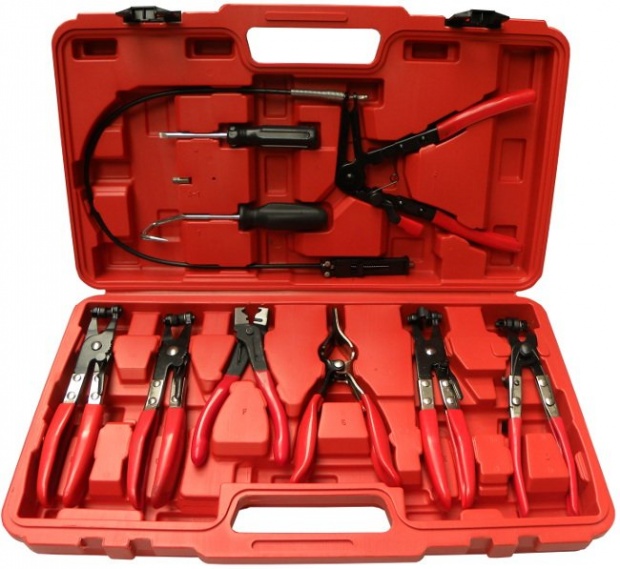 плоскогубці з поворотними губками - плоскогубці підходять для більшості типів пружинних затискачів, поворотні щелепи розрізаються для хорошого утримання великих і маленьких затискачів під будь-яким кутом. Храповий замок, що дозволяє утримувати щелепи в 5 різних положеннях. Замок дозволяє надійно утримувати натягнуту стрічку .