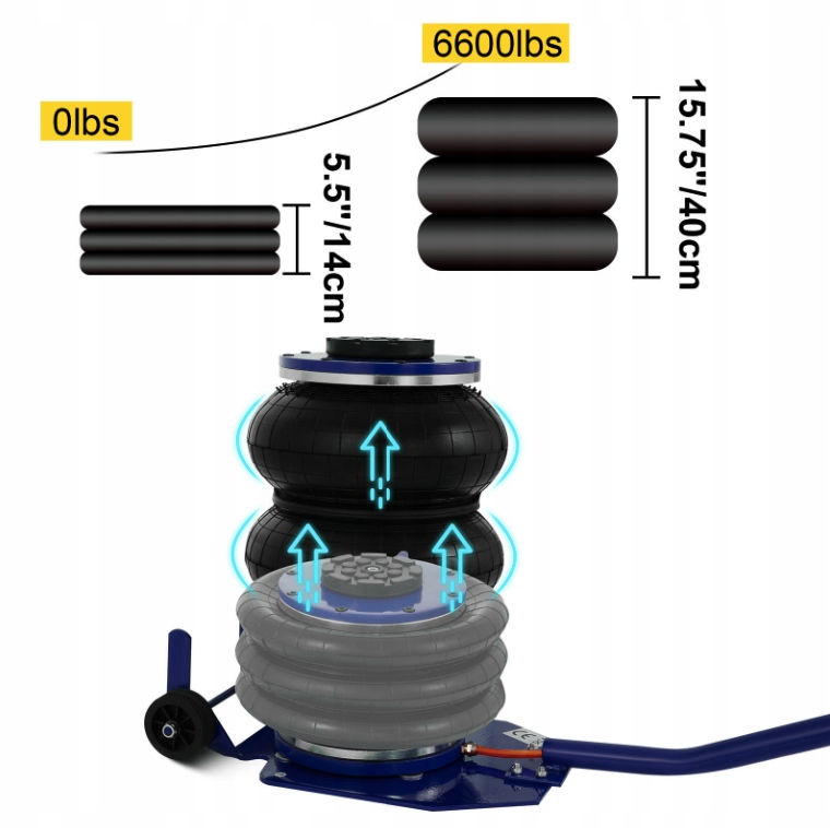 підйом від 14 см до 40 см займає всього 5 секунд, максимальна висота підйому підходить для більшості транспортних засобів. Робоча температура: -60 ℃ ~ 50 ℃.