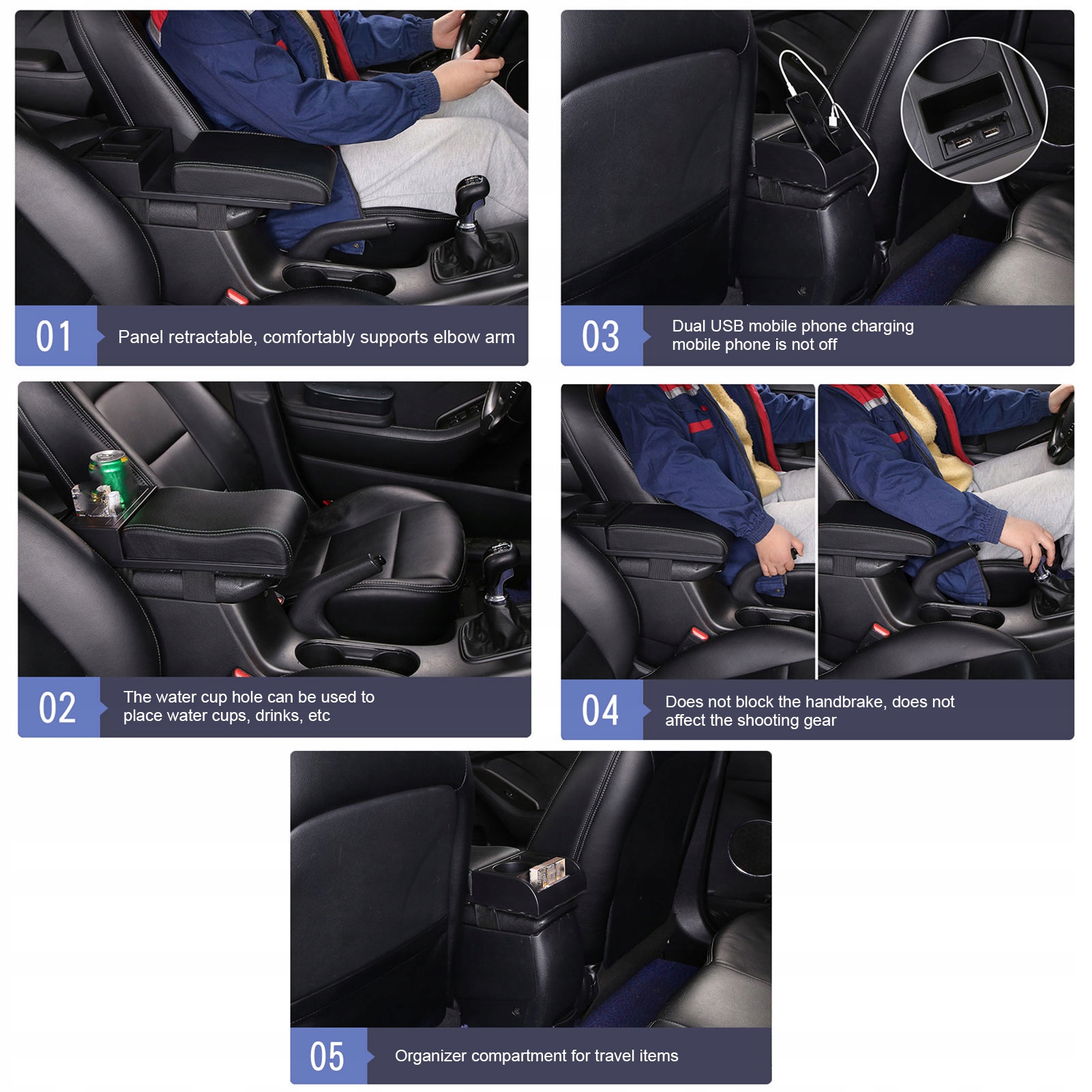 2. МНОГОФУНКЦІОНАЛЬНИЙ ДИЗАЙН: Ящик для зберігання підлокітника з вбудованим ящиком для зберігання, підстаканником та інтерфейсом USB, зручний для зберігання дрібних предметів, чашок і зарядного обладнання, максимально використовує простір в автомобілі, збільшує водіння комфорт.