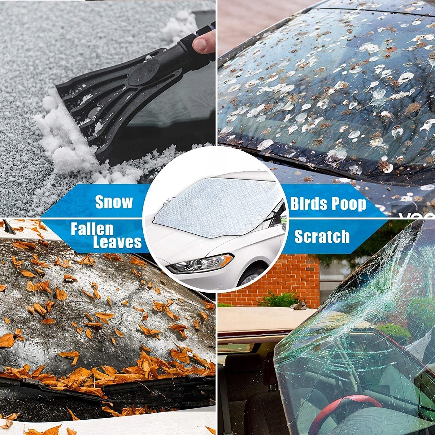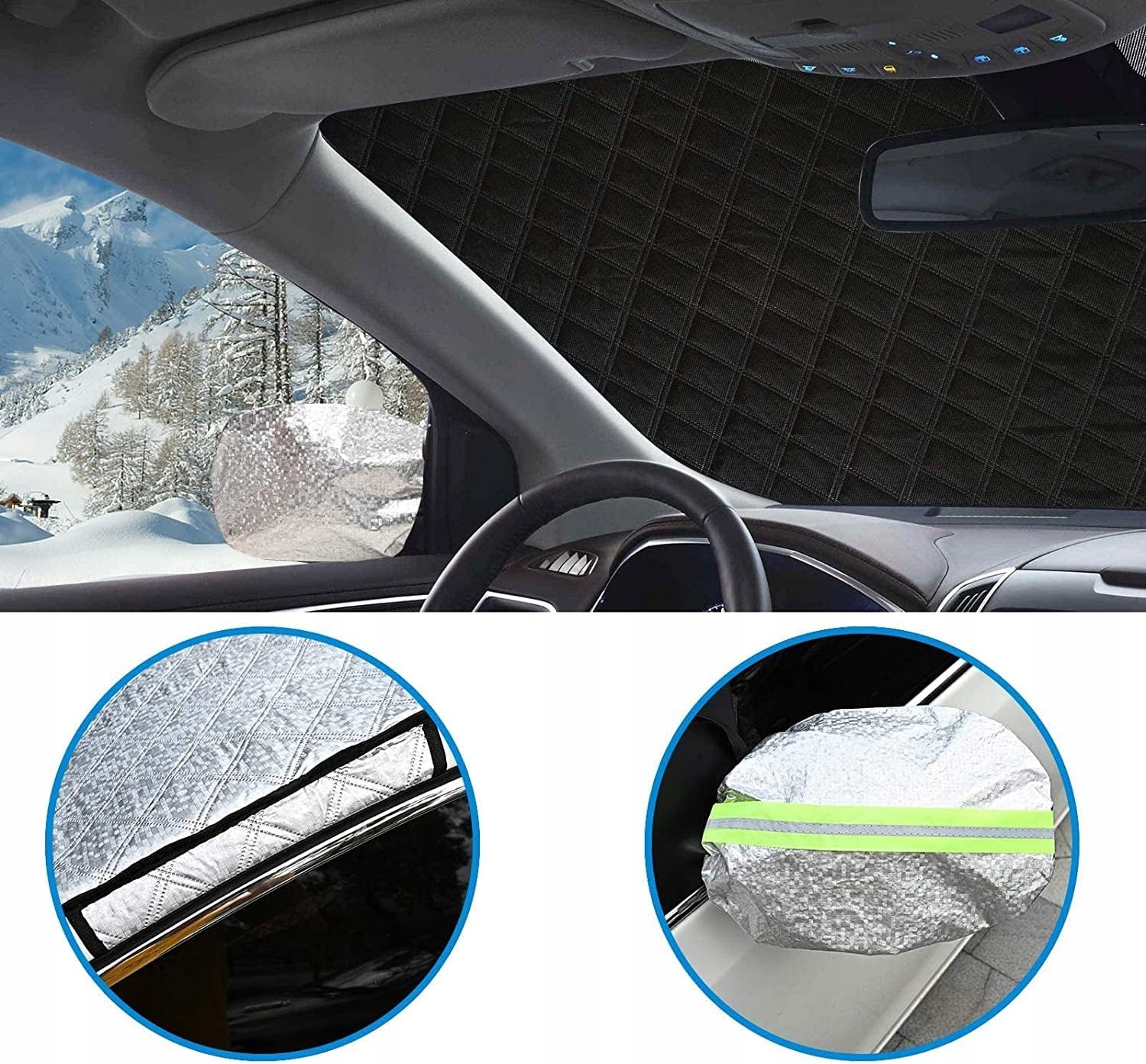ЧОТИРИ ШАРИ Магнітний козирок лобового скла має 4 шари різних матеріалів для забезпечення повного захисту від дощу, снігу та льоду Алюмінієва фольга PEVA водонепроникна проти ультрафіолетового випромінювання Легко чиститься бавовняна алюмінієва фольга додатково запобігає воді або замерзанню товстий бавовняний композит і м’яке внутрішнє покриття уникнути подряпин Розумний дизайн Наші кришки для вікон автомобіля мають покращений дизайн 7 магнітів забезпечують більшу стабільність подовжений дизайн захищає склоочисник і запобігає накопиченню бруду в слоті ok навушники зі світловідбиваючими смугами захищають дзеркало заднього виду та роблять вашу машину видимою вночі ПОВНИЙ ЗАХИСТ Автомобіль Антифриз може забезпечити чудовий захист від снігу або льоду, що накопичуються на лобовому склі взимку. Захистіть себе від УФ-променів влітку, блокуйте пил навесні та тримайтеся подалі від опалого листя восени та пташиного посліду в траві. Завжди тримайте лобове скло чистим і чистим - не потрібно зішкребти лід холодним ранком. ШВИДКЕ ВСТАНОВЛЕННЯ Щоб встановити сніговий покрив, вам потрібно лише три кроки. Спочатку встановіть бічні вушка дверей автомобіля, потім помістіть кришку дзеркала заднього виду і, нарешті, відрегулюйте її положення так, щоб магніт був прикріплений, це займає лише десять секунд. Підходить для більшості автомобілів шириною 148 см x 1165 см. Забезпечується захист від замерзання повне покриття. Ідеально закриває все лобове скло, підходить для малих і середніх автомобілів. Снігове покриття можна легко скласти для зберігання в багажнику або на задніх сидіннях. Щоб забезпечити правильну посадку, будь ласка, виберіть розмір лобового скла