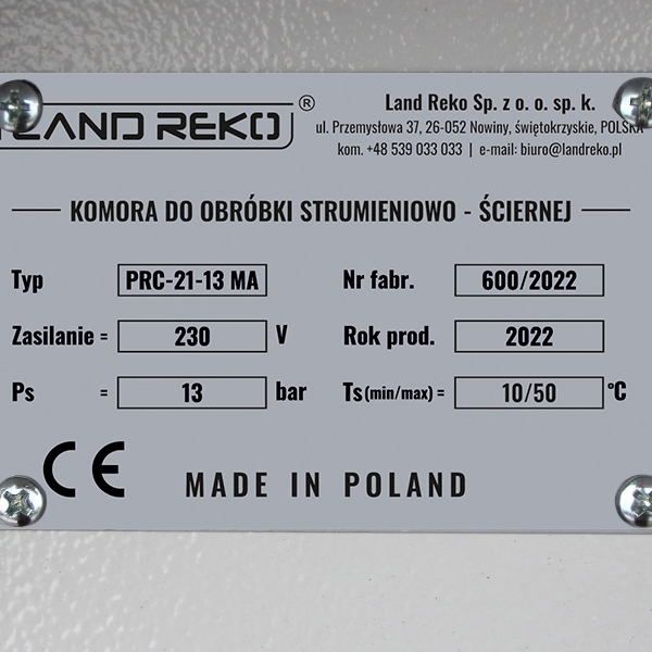 Пескоструминні машини серії Land Reko® PRC — це спеціалізовані абразивно-струменеві машини, призначені для чищення дисків автомобілів. Профільований поворотний робочий стіл, оснащений 3-ступінчастим регулюванням кута положення заготовки, позитивно впливає на процес обробки. Обертання робочого столу навколо своєї осі забезпечує вплив абразивного потоку на 360 градусів і отримання повторюваної поверхні з однорідною структурою і заданими параметрами. Струменевий апарат PRC-21-13 дозволяє обробляти диски розміром до 21” і вагою до 70 кг при тиску до 13 бар. Пристрій оснащено високоякісним абразивним дисковим клапаном Clemco, який характеризується механічною міцністю та стійкістю до стирання вище середнього порівняно зі стандартними клапанами, встановленими в дробеструйних машинах конкуруючих компаній.