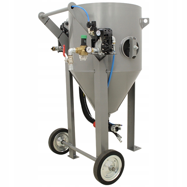 пропонована багатофункціональна струменева машина-це професійне, безпечне і сучасний пристрій польського виробника. Очищувач оснащений напірним баком з конічним дном для полегшення зісковзування матеріалу і ревізійним зливом, що дозволяє швидко спорожнити резервуар від абразиву. Високоякісний німецький абразивний клапан Macro + відрізняється підвищеною механічною міцністю і стійкістю до стирання в порівнянні зі стандартними клапанами, встановленими на очисниках конкуруючих компаній. Управління очищувачем легко і безпечно завдяки розташуванню рукоятки управління на кінці робочого проводу. Безперечною перевагою цього рішення є можливість переривання роботи пристрою оператором, безпосередньо виконує процес піскоструминної обробки, що продиктовано останніми правилами техніки безпеки. Конструкція клапана усуває необхідність в дорогих діафрагмах і поршнях.