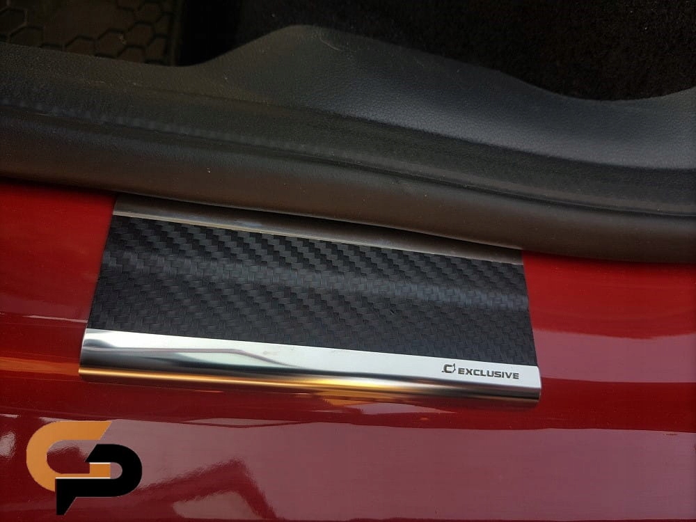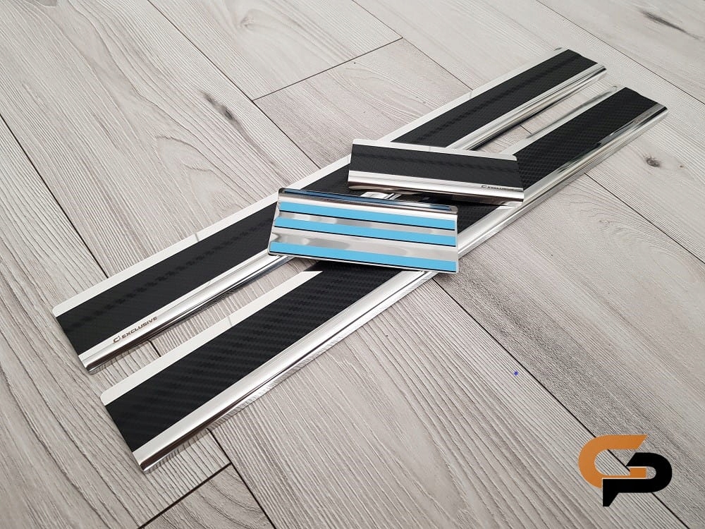 планки виготовлені з нержавіючої сталі і додатково обклеєні вуглецевої плівкою. Завдяки шпону накладки ще більш стійкі до подряпин, ніж стандартні сталеві планки.е>