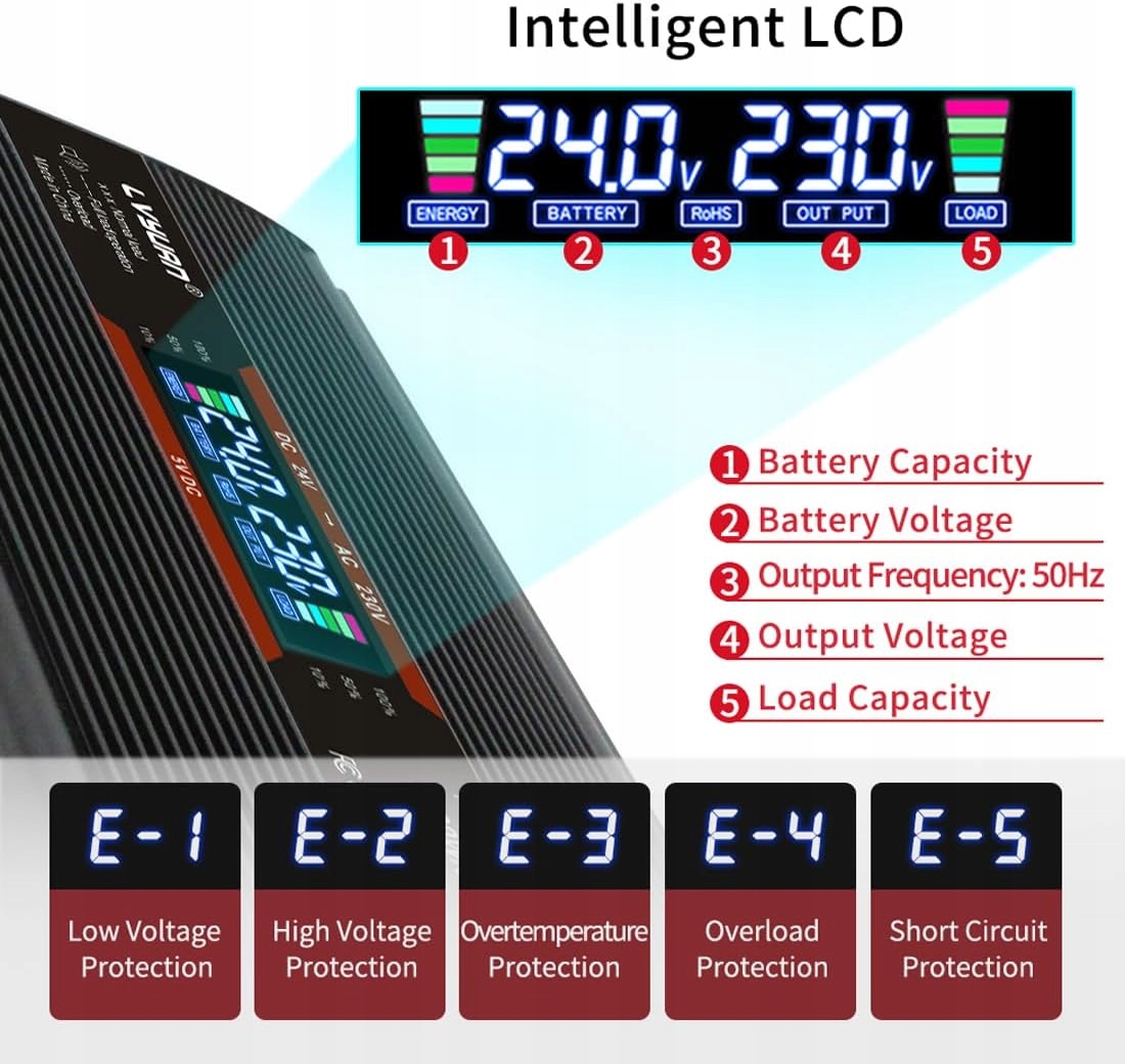 РК-дисплей і світловий індикатор - РК-дисплей показує стан батареї, напругу батареї, вихідну напругу та зарядну ємність. Має роз'єм USB 5 В і два розетки змінного струму (розетка ЄС). Три індикатори, два зелені індикатори USB і живлення, червоний індикатор помилки. Ви можете знати робочий стан пристрою.
