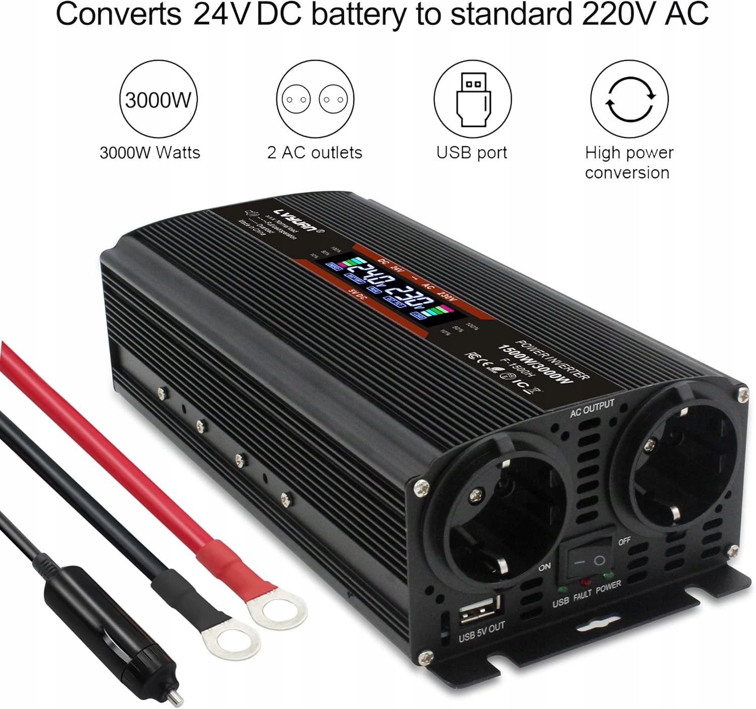 Інвертор преміум-класу 1500 Вт / 3000 Вт - високоякісна модифікована синусоїда перетворює 24 В постійного струму в змінний струм найвищої якості, майже еквівалентний домашньому електроживленню. Новий інвертор поєднує в собі високу якість виготовлення з довговічною високоякісною модифікованою синусоїдальною технологією, що підходить для роботи багатьох пристроїв напругою 230 В. Цей пристрій не підходить для кавоварок Nesspresso, Tassimo або інших.