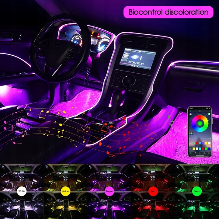 8 монохромних режимів: смуги освітлення салону автомобіля, барвисті RGB (червоне світло / Синє світло / зелене світло / біле світло / теплий білий / жовте світло/рожевий Фіолетовий / Синій лід).е>