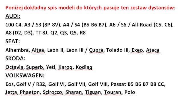 оригінальні розпірки для розширення осі з гвинтами. Високоякісний продукт, виготовлений в Німеччині з міцного, міцного дюралюмінієвого сплаву. Велика колія і спортивний зовнішній вигляд-це лише деякі з переваг дистанцій, також різко поліпшується зчеплення автомобіля з дорогою на поворотах, установка не доставляє ніяких проблем.