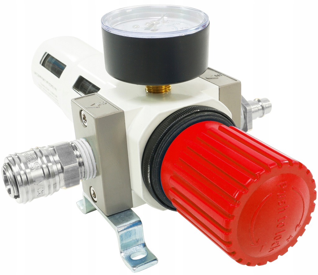 Модуль фільтра оснащений фільтрувальним вкладишем . Конденсат збирається в накручується ємність з ручним зливом. Коли ємність заповниться (приблизно на 10 мм нижче фільтруючого елемента), видаліть конденсат, відкривши зливний кран. Діапазон вимірювання манометра 0 - 16 бар . Циферблат градуйований у стовпчиках з точністю до 0,2 бар. Манометр можна встановити в порт на корпусі фільтра-редуктора - на вибір є два підключення манометра: спереду або ззаду. Невикористаний порт слід підключити штекером, який входить у комплект.