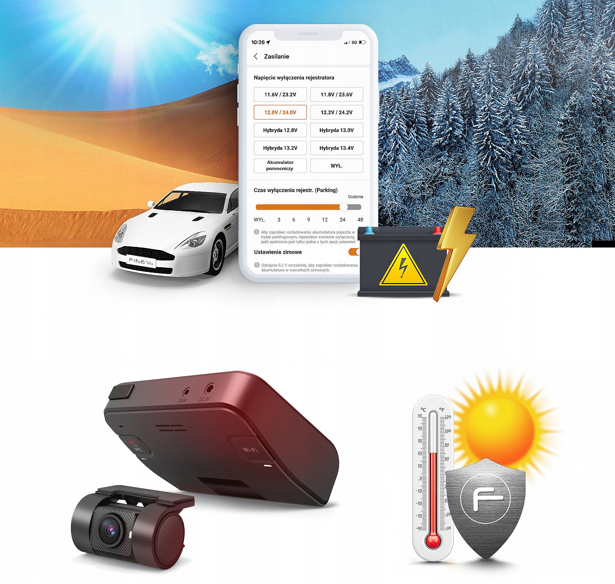 Зимовий режим – більш ефективний захист акумулятора автомобіля взимку. У зимові місяці ця функція підвищує встановлену напругу відключення реєстратора на 0,2 В. Завдяки цьому реєстратор в режимі паркування вимкнеться раніше, щоб більш ефективно захистити акумулятор автомобіля від глибокого розряду в більш складних зимових умовах (наприклад, якщо напруга встановлена на 11,8 В, реєстратор вимкнеться при 12,0 В взимку) . Зимова установка працює за внутрішнім календарем.