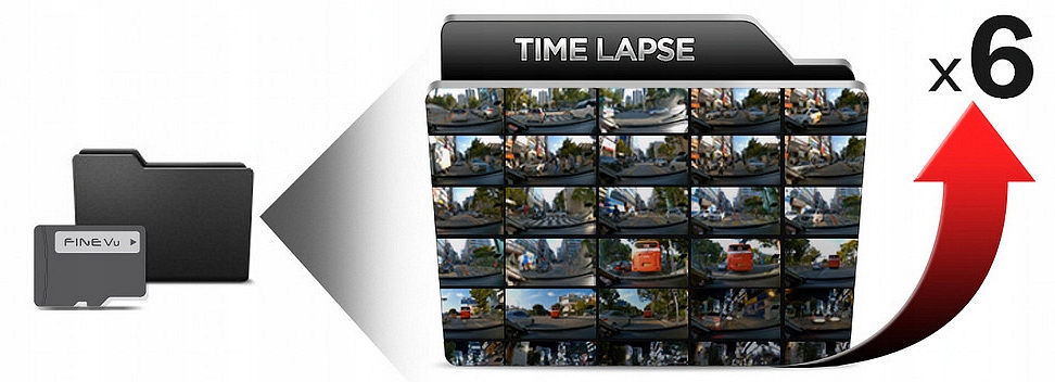 Автомобільна камера FineVu GX4K оснащена режимом запису Time Lapse, який максимізує ефективність запису. Завдяки цьому ви можете записувати відео на одну і ту ж карту пам'яті, щоб заощадити місце на карті. Відтворення зі звичайною швидкістю дозволяє швидко переглядати відео за весь період запису. У режимі Time Lapse рекордер FineVu GX4K із картою пам’яті на 32 ГБ може безперервно документувати 743 хвилини реального часу, не перезаписуючи старі записи. Щоб задокументувати цей проміжок часу під час стандартного запису, потрібно приблизно 167 ГБ пам’яті.