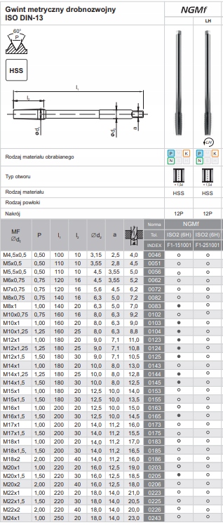 верстат NGMF з тонкою метричною різьбою призначений в основному для виготовлення гайок. Його також можна використовувати для створення глибоких наскрізних отворів. Матеріалом інструменту є високопродуктивна високошвидкісна сталь-вона відрізняється високою зносостійкістю.