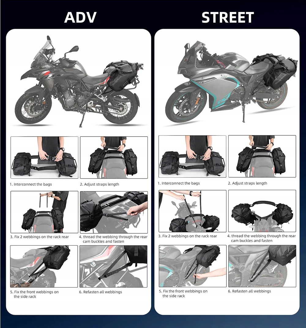 відмінна водонепроникність: сідельна сумка для мотоциклів виготовлена з брезентового матеріалу ПВХ 500D, який є 100% водонепроникним і найміцнішим матеріалом для мотоциклів. Висувна конструкція забезпечує водонепроникність, забезпечуючи швидке відкриття та закриття.