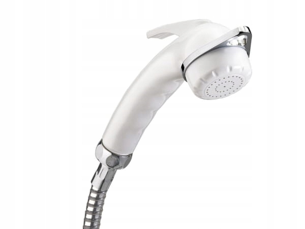 зовнішня душова розетка білого кольору з душовим шлангом, що підключається за допомогою швидкороз'ємного з'єднання і змішувача для гарячої та холодної води.е>