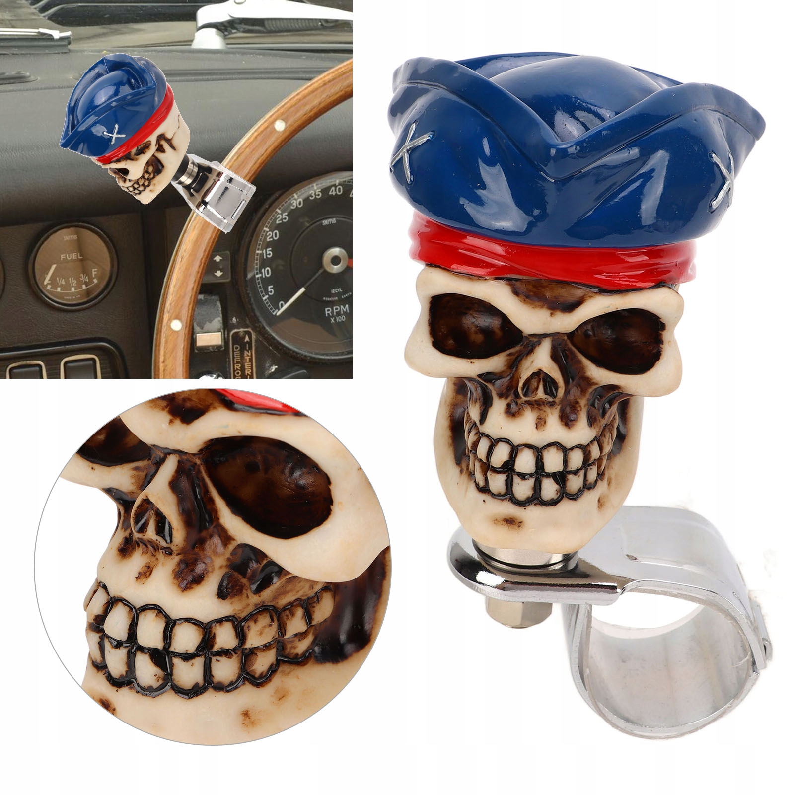 1. Плавне водіння: Куля керма розроблена для збільшення крутного моменту керма та зменшення радіуса повороту під час виконання складних маневрів автомобіля. 2. Модний дизайн: прикраса ручки керма у вигляді черепа може зробити вашу машину веселішою та моднішою, додати унікальний стиль. 3. Матеріал: ручка керма водія виготовлена з металу та смоли, міцна та надійна у використанні, зручна в експлуатації, не легко вицвітати, ламатися чи деформуватися. 4. Практичність: ручка може давати водіям силу тягнути жорсткі рухи автомобіля, підходить для початківців, полегшуючи поворот, зберігаючи хороший контроль. 5. Широке застосування: рульова ручка підходить для більшості автомобілів, вантажівок, тракторів, човнів тощо. Діаметр фіксуючого кільця становить приблизно 3 см/1,2 дюйма.