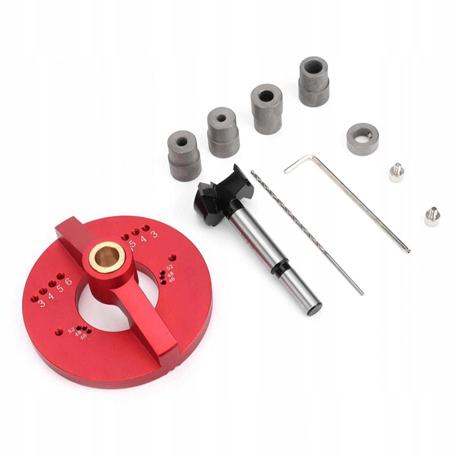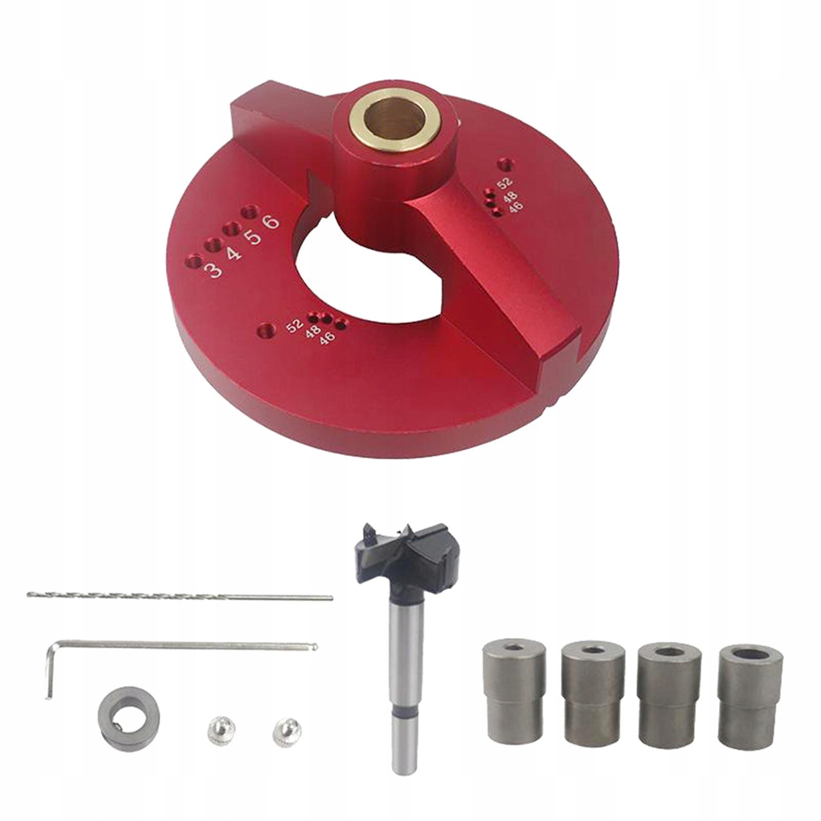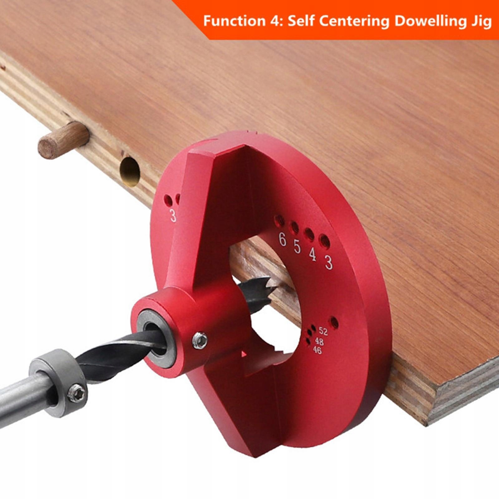 4 функції в 1 інструменті: 1. Вибивання петель 35 мм, Отвори для гвинтів в банках петель 46 мм, 48 мм, 52 мм; 2. Вертикальний перфоратор; 3. Намалюйте центральну лінію на стороні дошки; 4. Дирокол для дюбелів.е>