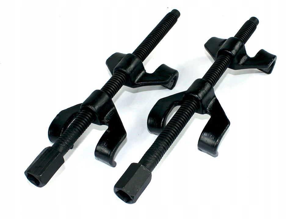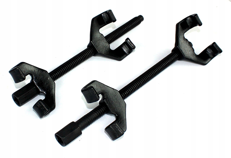 пружинні Знімачі необхідні для професійного обслуговування шасі. Підходить для всіх типів пружин в колонах МакФерсона і незалежних пружин. Знімачі працюють з тріскачкою 1/2". Вони мають тонку нитку, що полегшує роботу під навантаженням пружини. Робота безпечна завдяки спеціально профільованим двухруким ручкам.