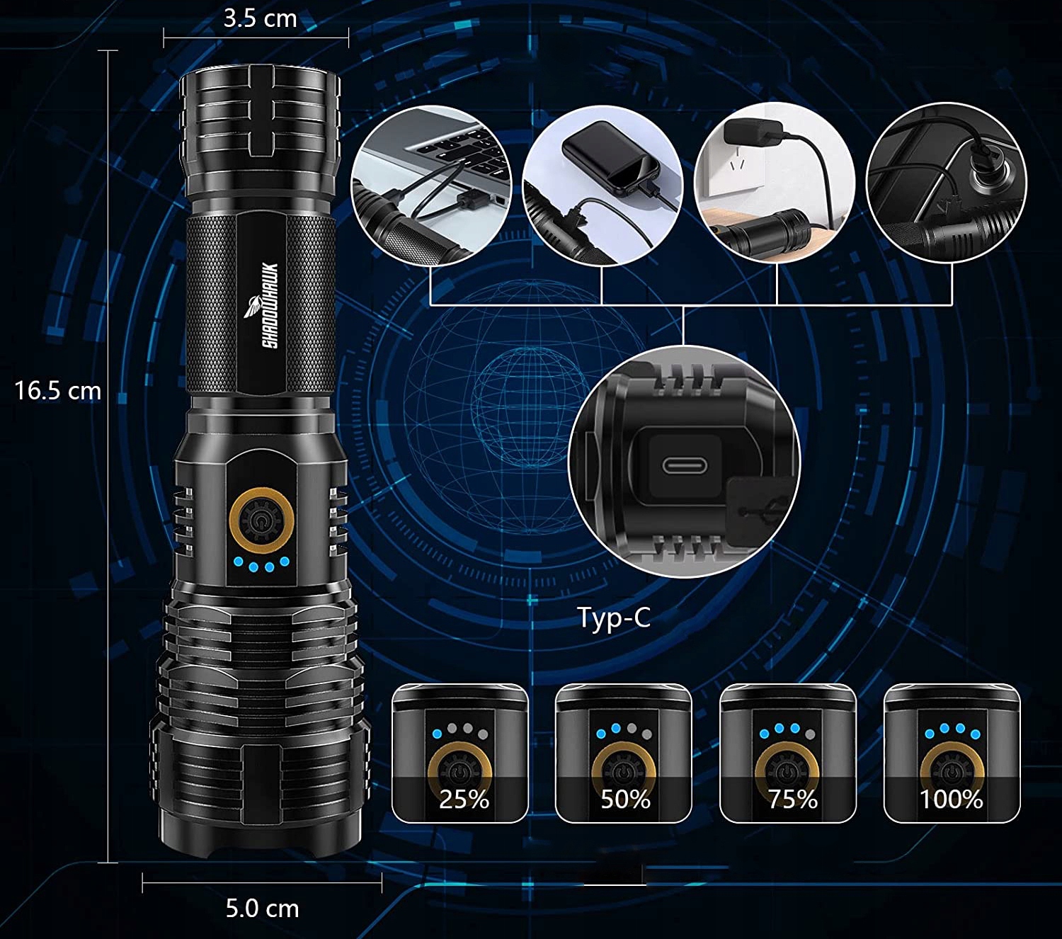 - 5 режимів: сильний / середній / низький / стробоскоп / SOS